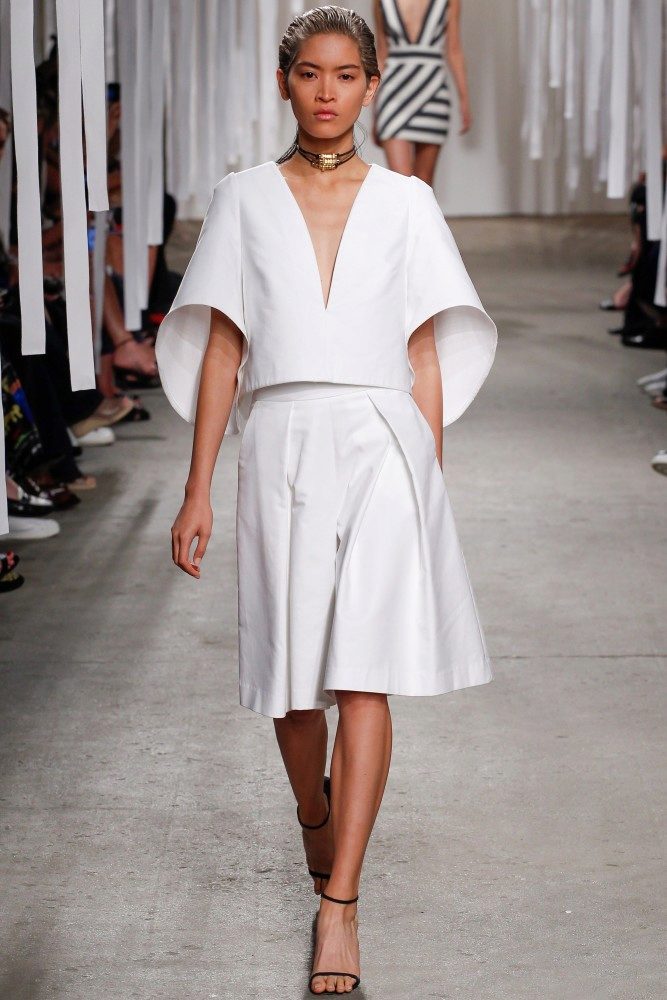 - Alicia Wikander in a white suit, consisting of culottes and a miniature top, and elegant black sandals.