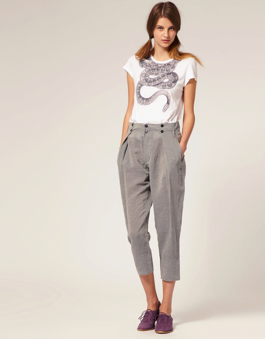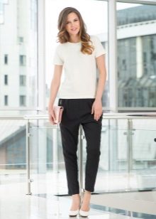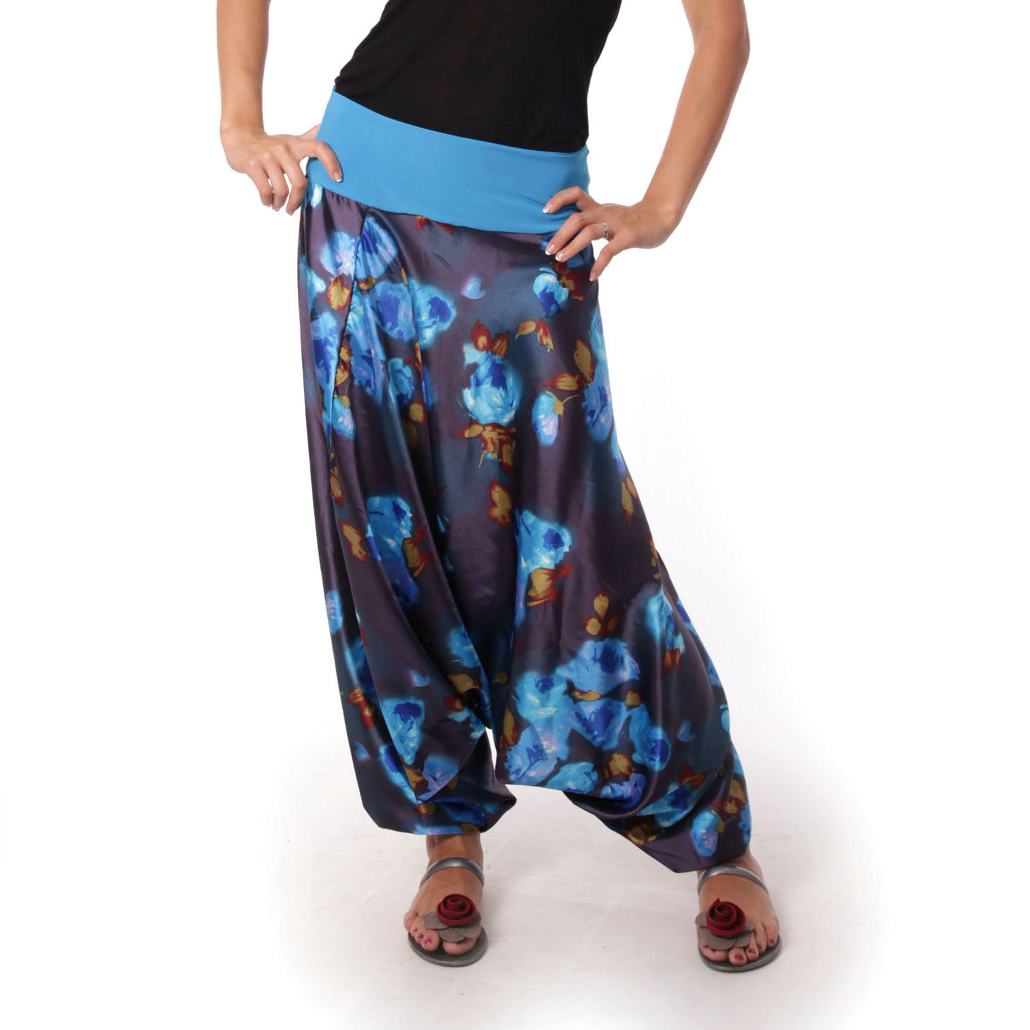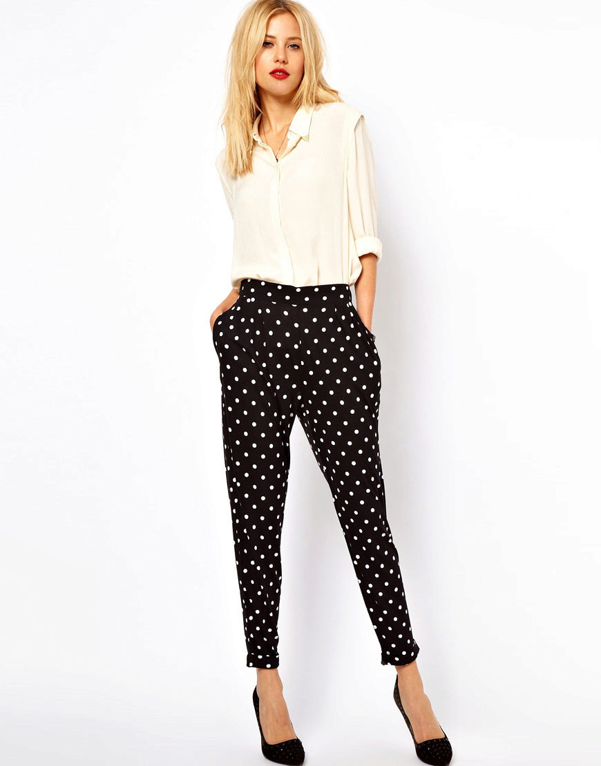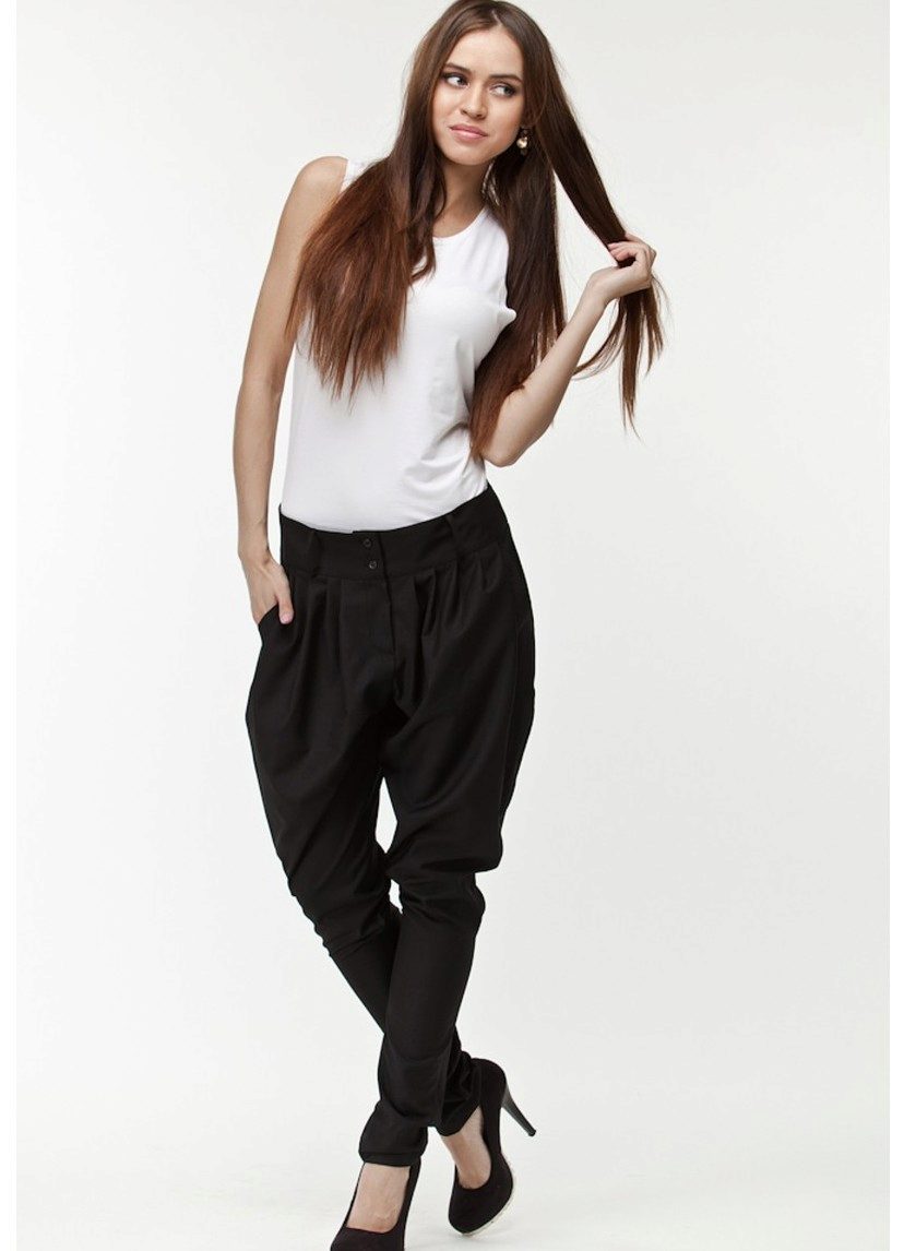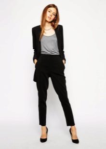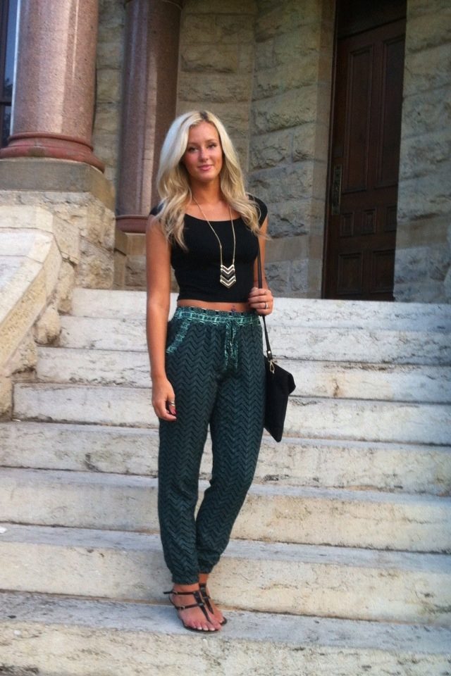 "Harem" pants with a bright print will be appropriate both at home and on a walk. Due to the bright colors, the image will turn out to be unusual, but you should not overdo it in color combinations, so that the image does not turn out to be too colorful.