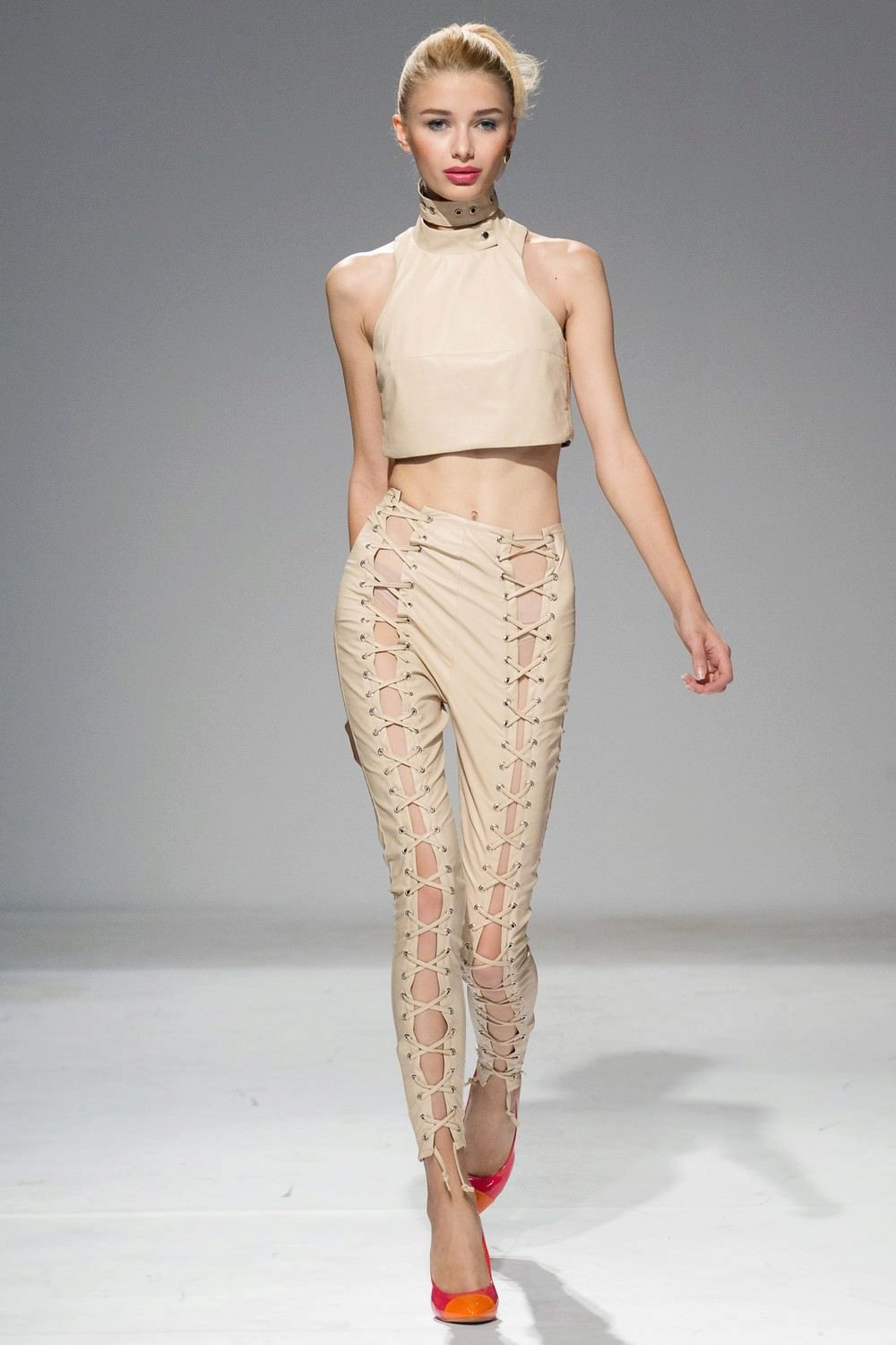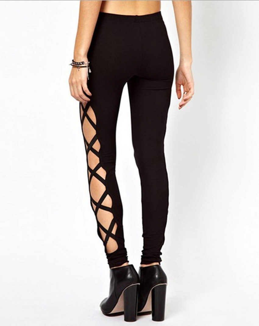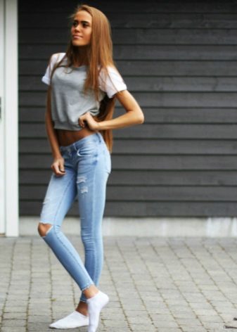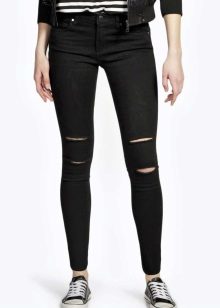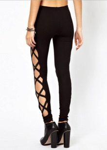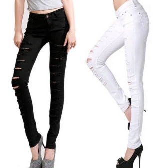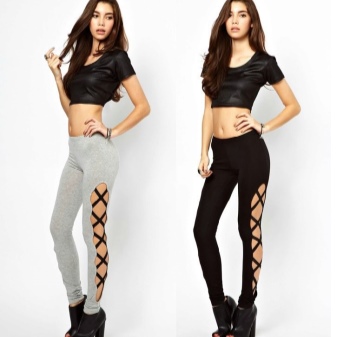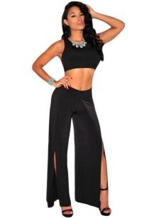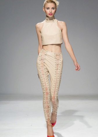 Trousers with bold cuts and figured notches are usually made in tight-fitting models, so they are more suitable for girls with a slim, taut figure. Great combination with a sporty top in the form of May and T-shirts, and high-heeled shoes.
