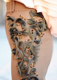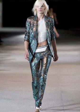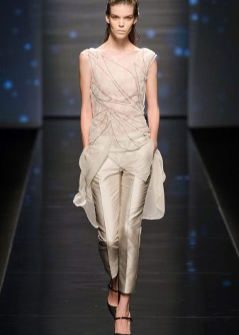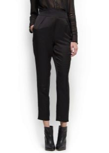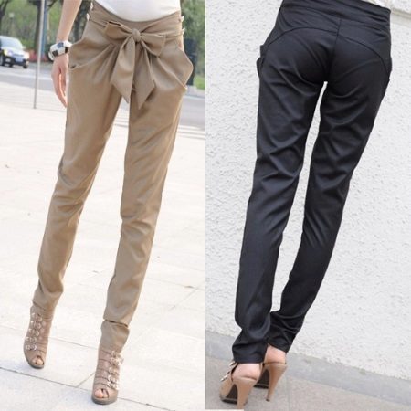 When creating trousers designers pay special attention to matter. These are cotton, flax, wool, tweed, satin and knit fabrics, leather ... For evening styles, traditional brocade and velvet. Silk, satin and chiffon fabrics are ideal not only for light summer and beach pants, but also indispensable for cozy home wear. Fleece sports trousers will not allow its owner to freeze in the open air.