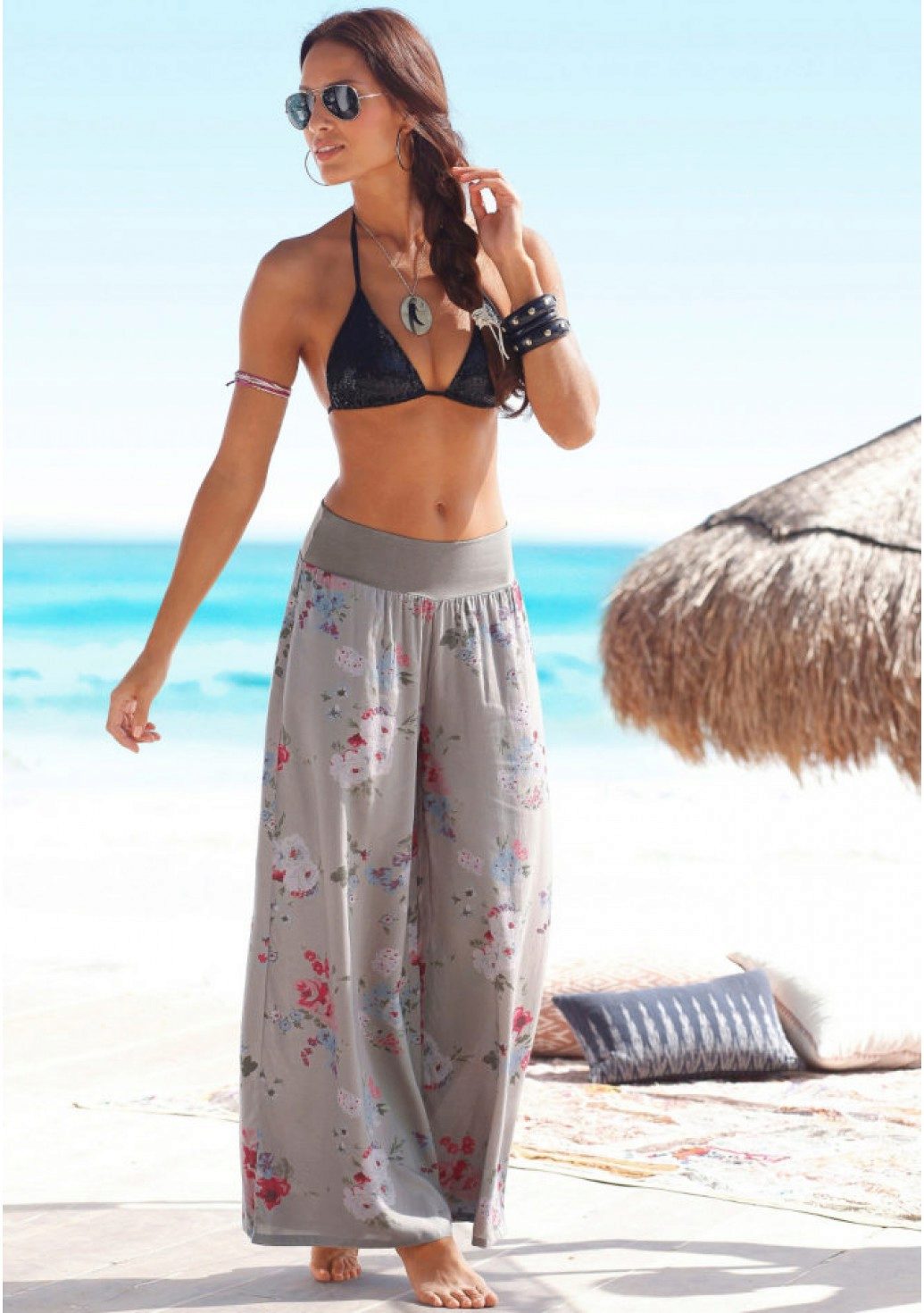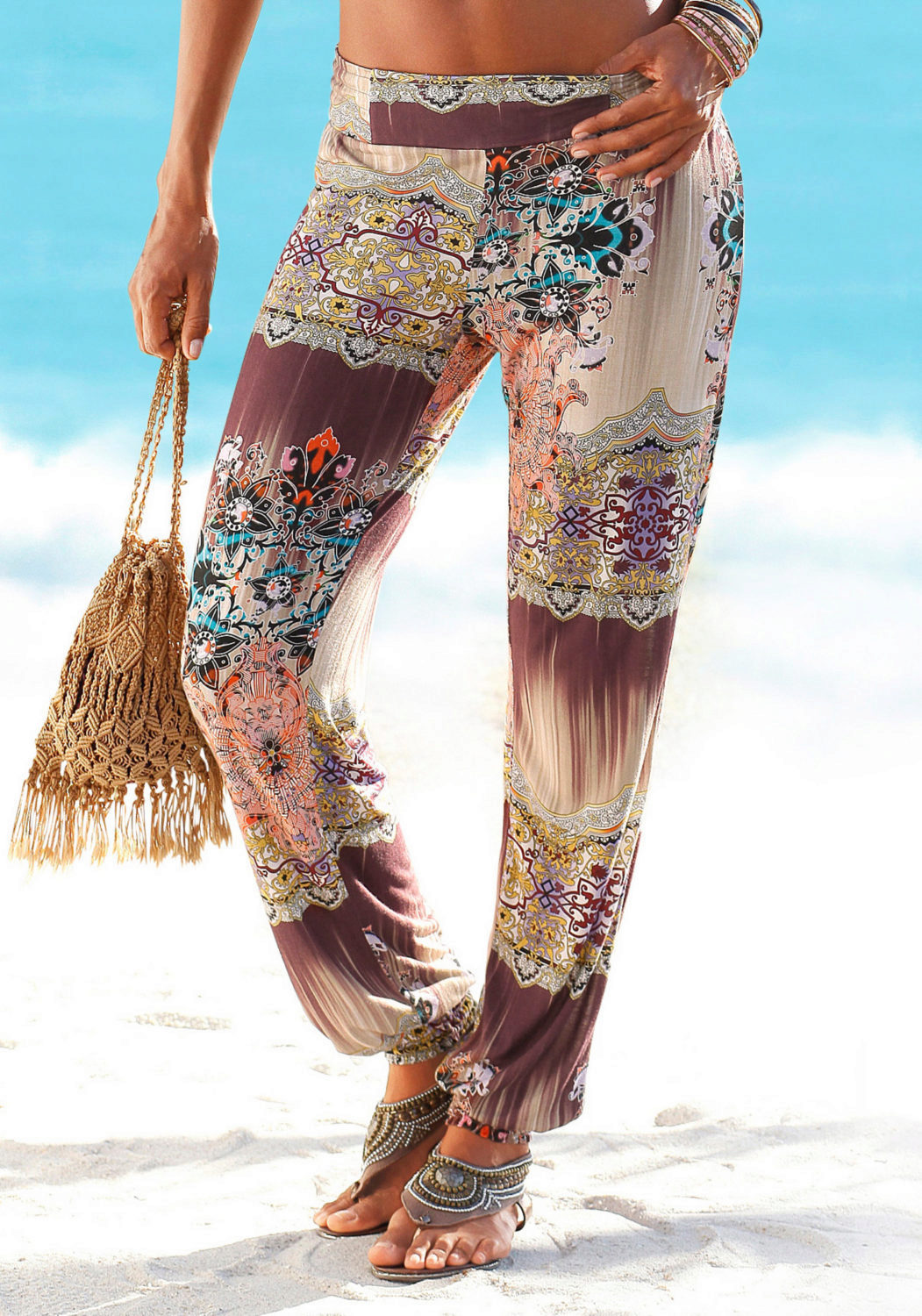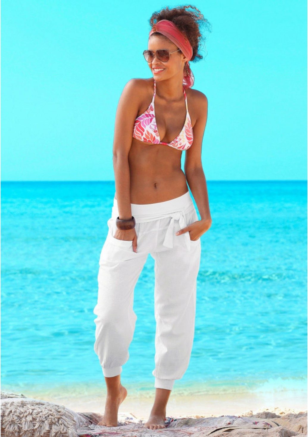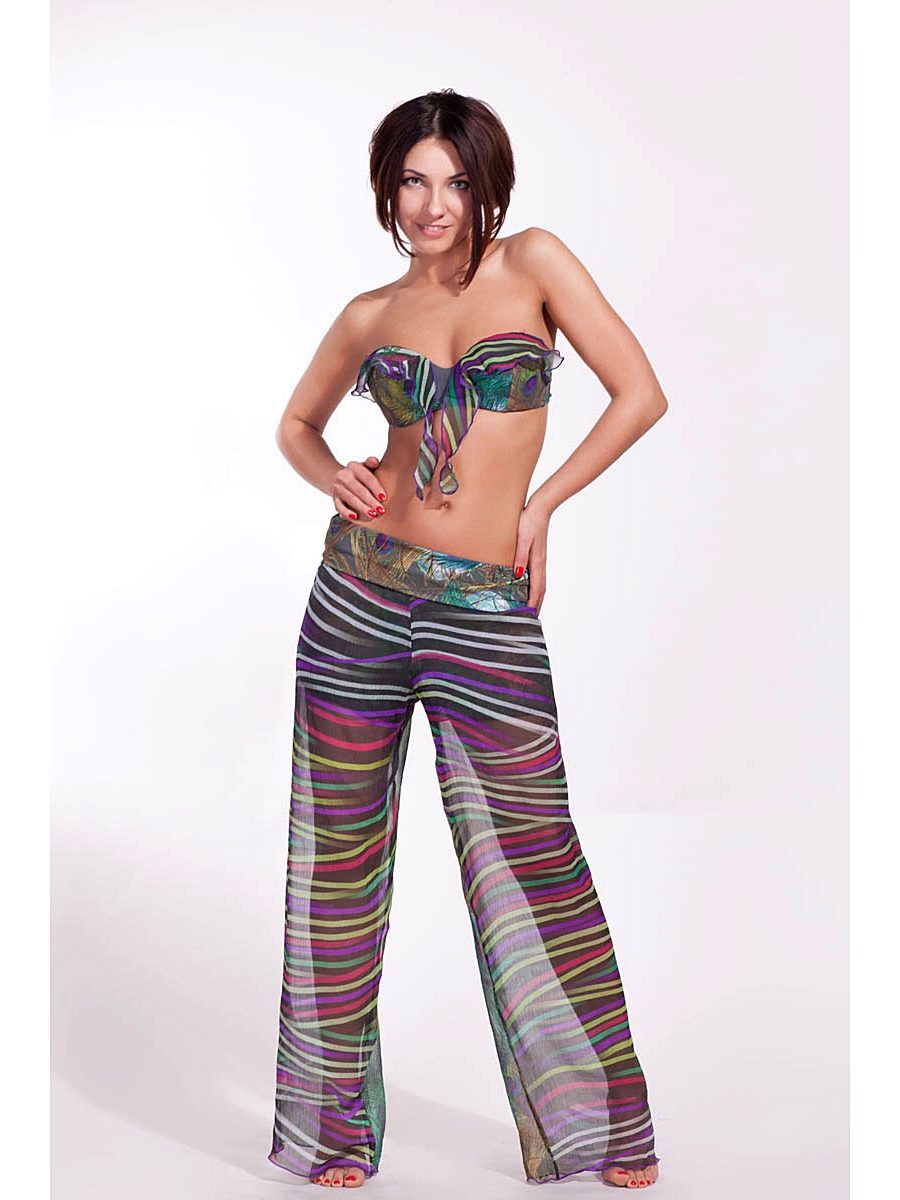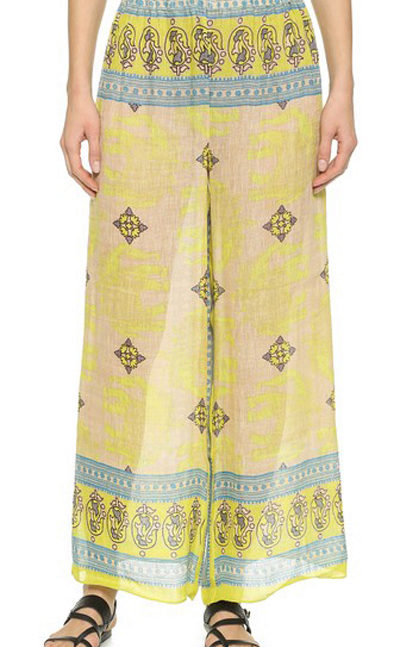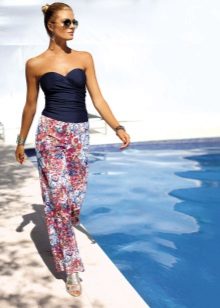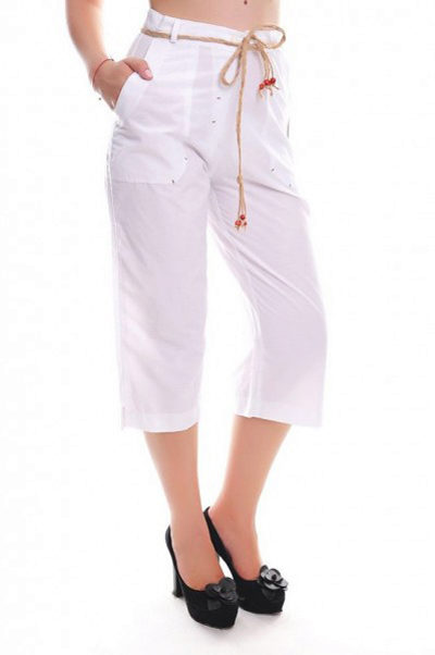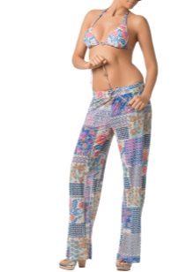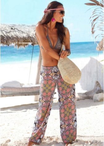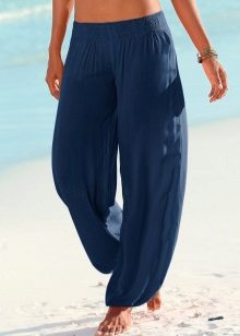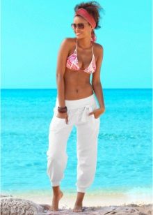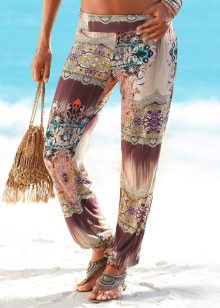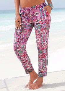 The most fashionable models - on a belt, elastic band, with ties, cuffs. The most current length is ankle-length or slightly lower. The most popular colors are white, all shades of red, blue and light green. Beautiful on the beach pants look vegetable, animal, exotic and geometric prints.