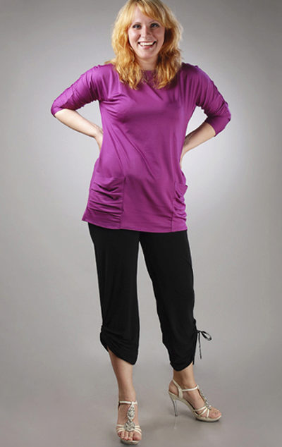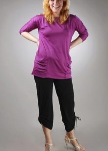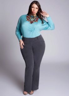 You should avoid bright and screaming colors of trousers. Constructive and decorative elements should be on the hips, in order to divert the attention of others from a full tummy.