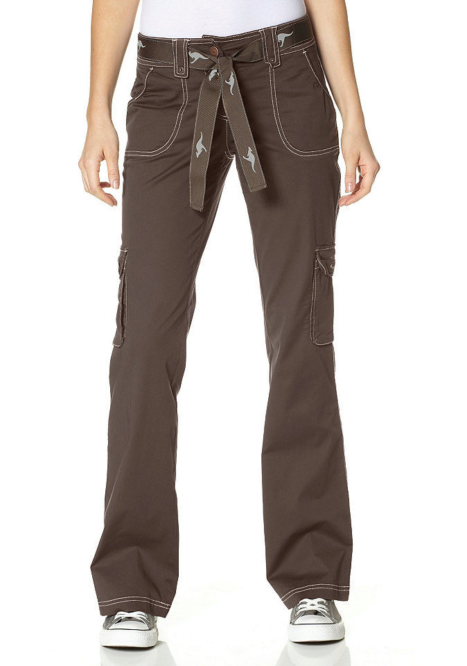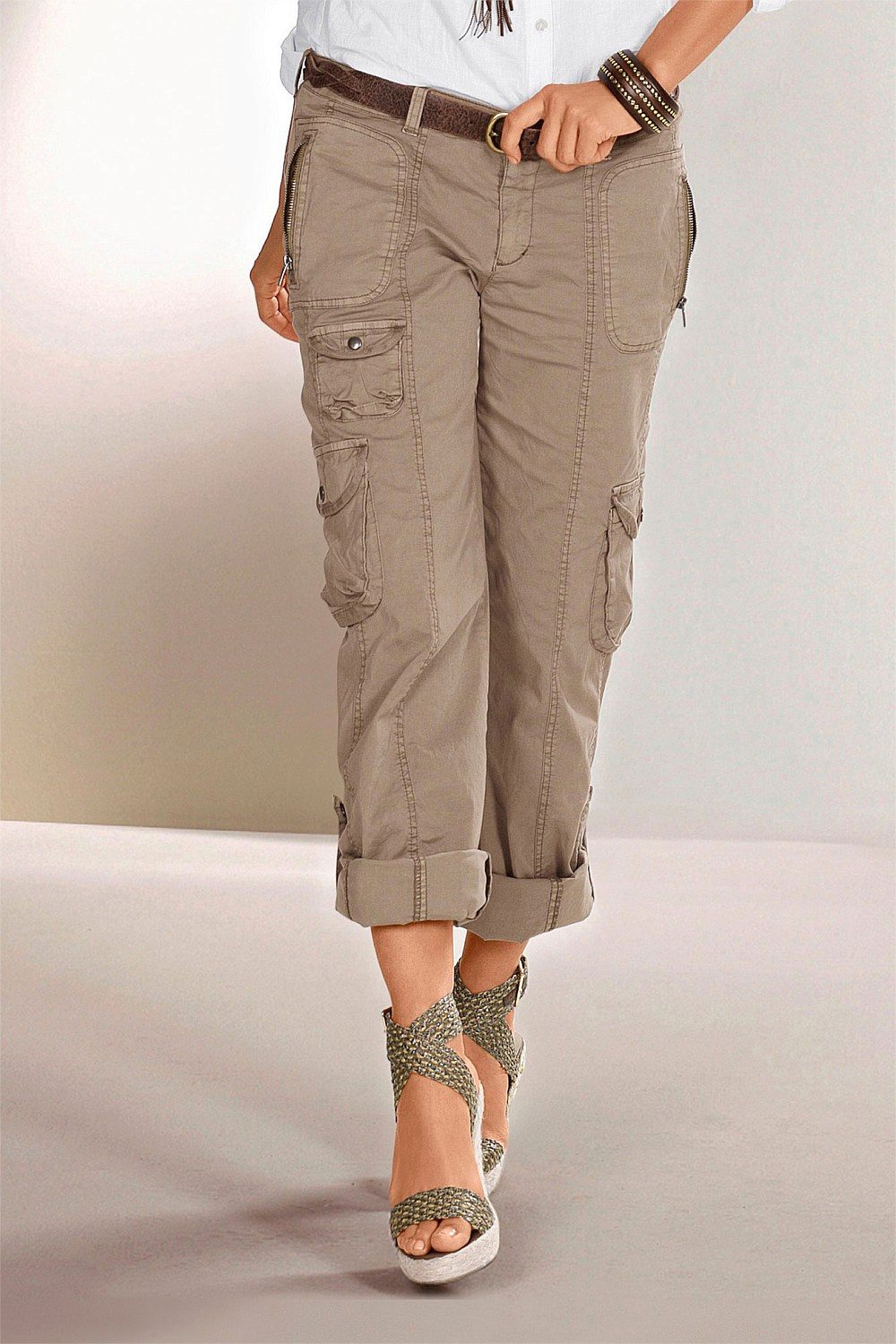 Safari - trousers of natural shades, made of strong fabric, with sewn pockets, stitching, buckles or rivets.