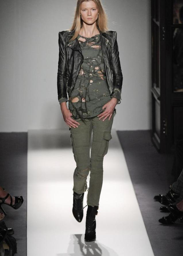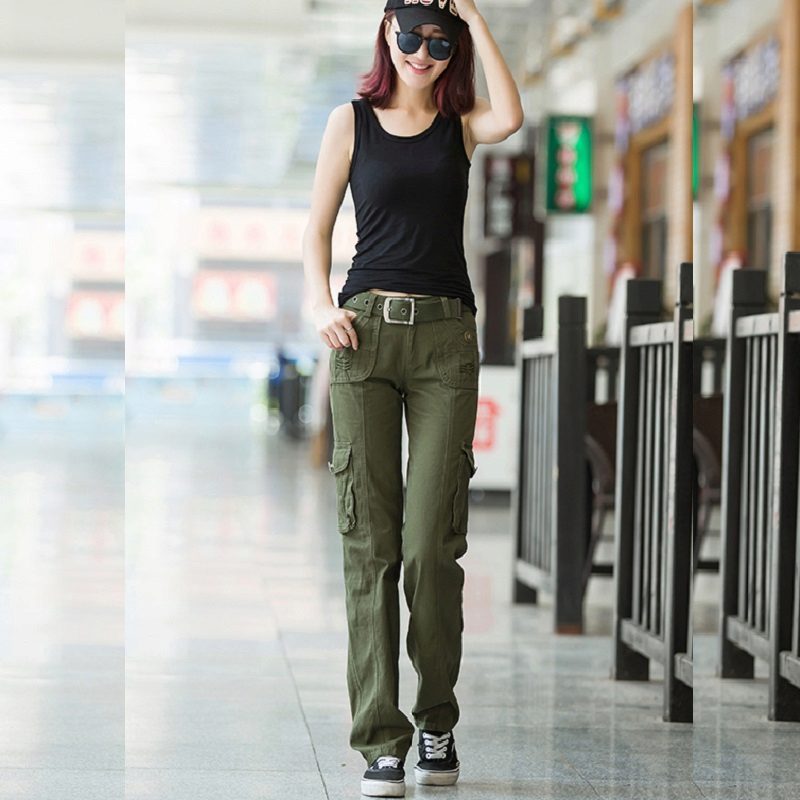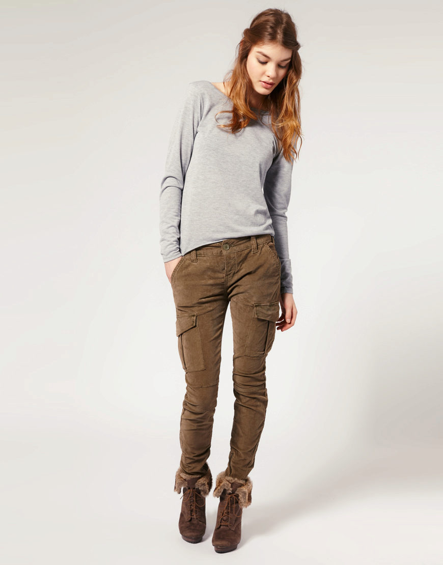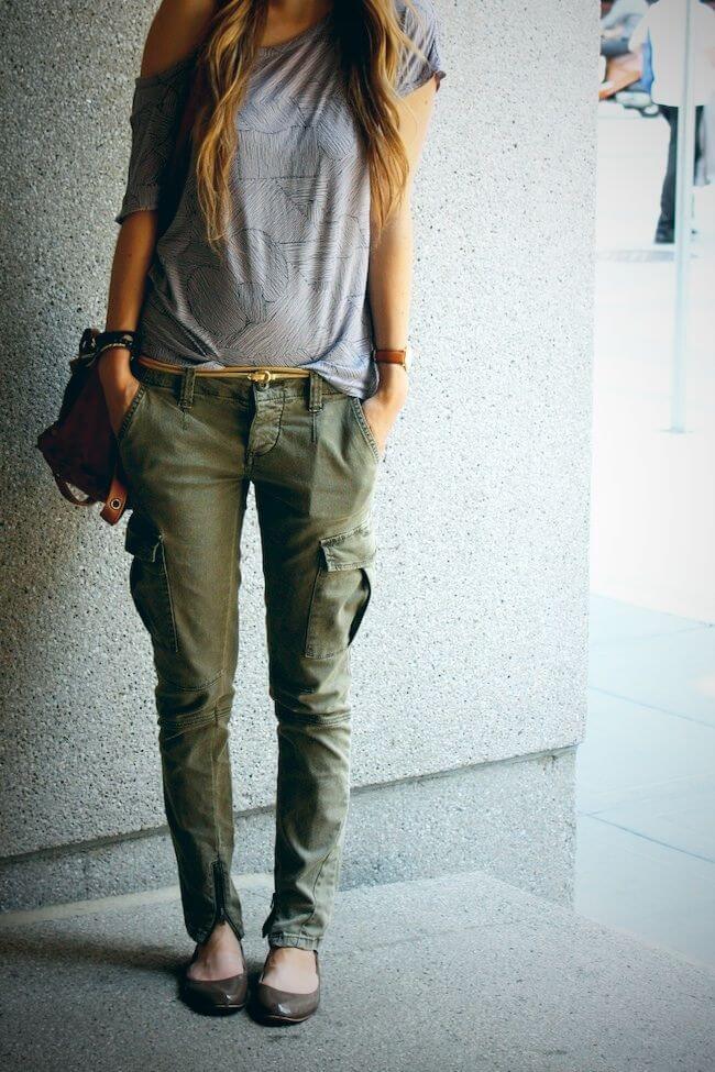 Cargo pants in military style at the height of fashion this season, they are perfectly combined with a sporty dark top and boots in a military style.