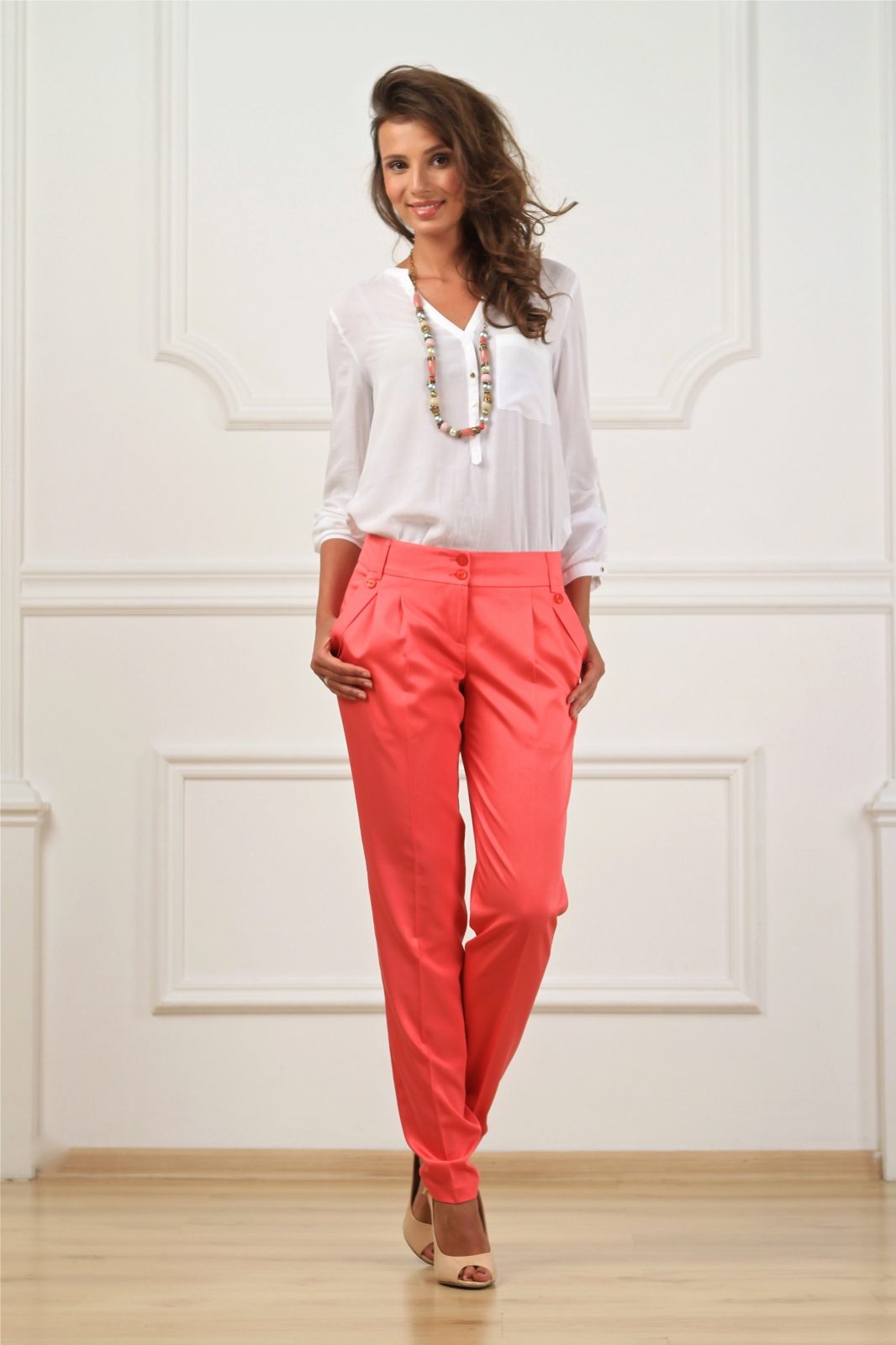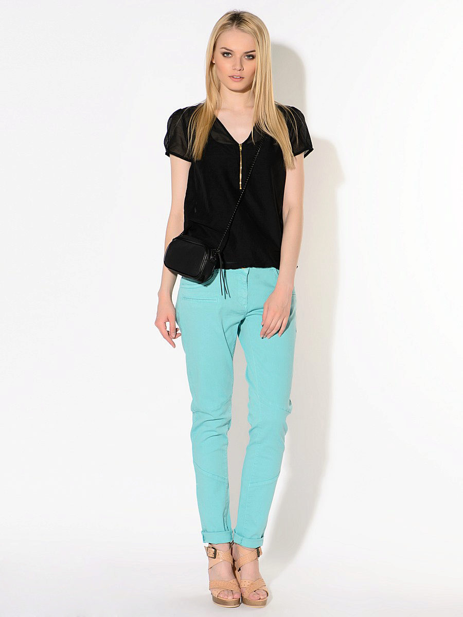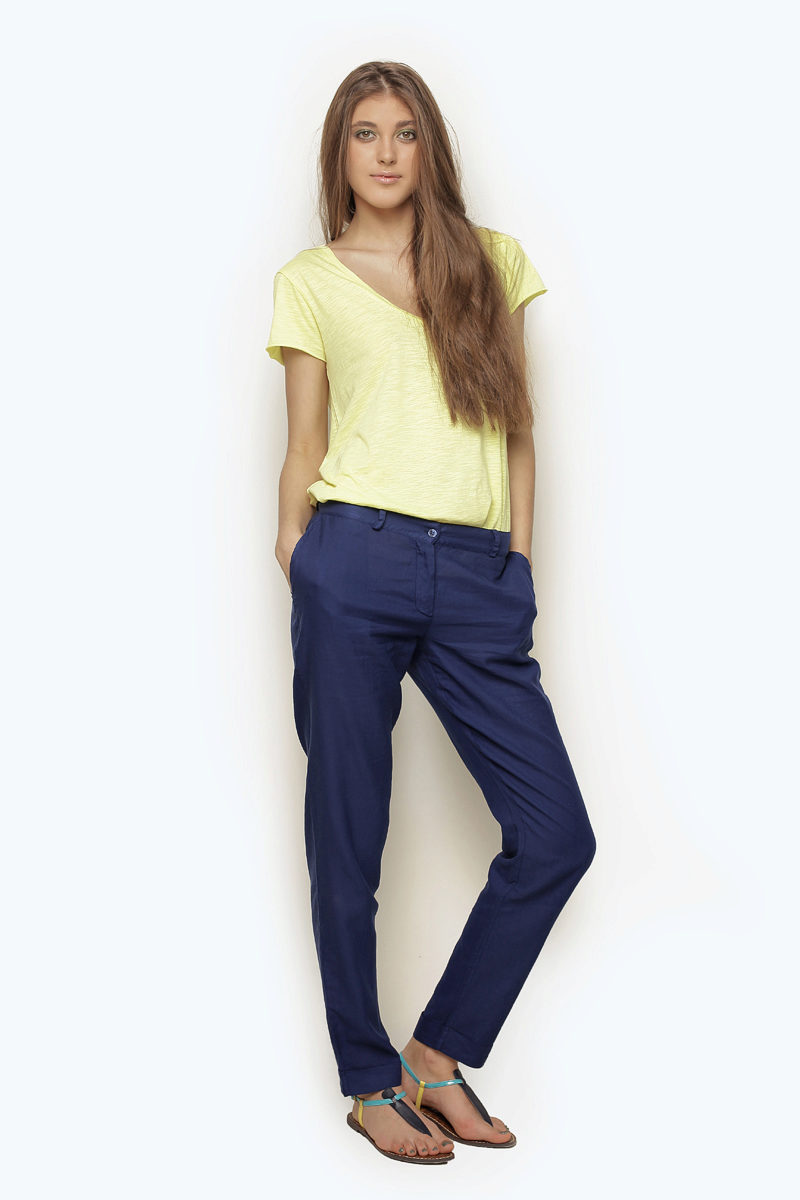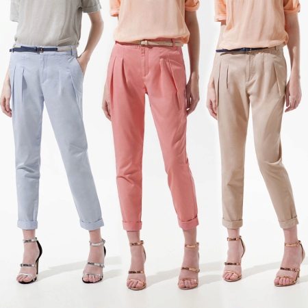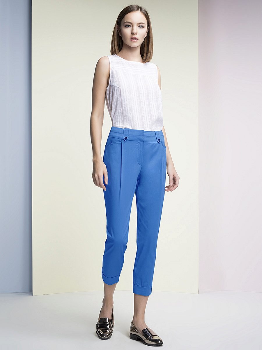 The basic range of summer women's trousers is based on all shades of blue and green. We should not forget about bright summer flowers: orange, yellow, blue, lilac and coral. All gold and ocher shades of trousers look great.