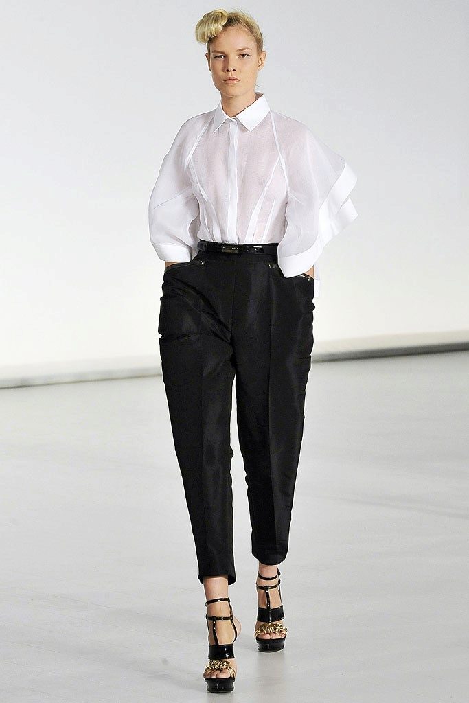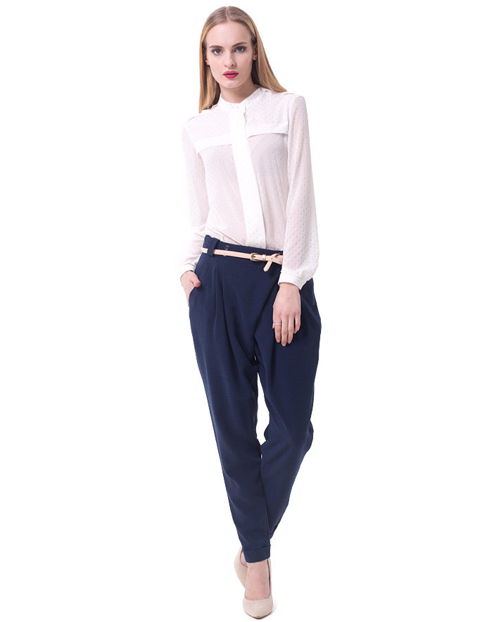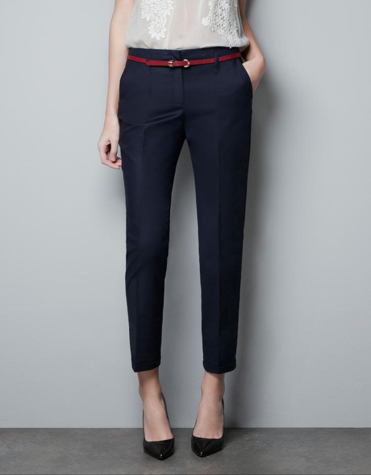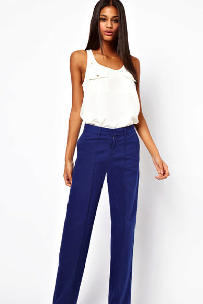 This type of figure is quite complicated - narrow hips, a rounded shoulder line, a small bust, an unobtrusive waistline and a pronounced belly. But representatives of the apple figure usually have slender legs. Suitable trousers for this type of figure are those in which the waist is clearly expressed. At the same time landing is to choose high. Low waistline will only provide extra volume. Suitable styles of trousers on the figure apple: classic strict straight, with arrows, wide and flared.