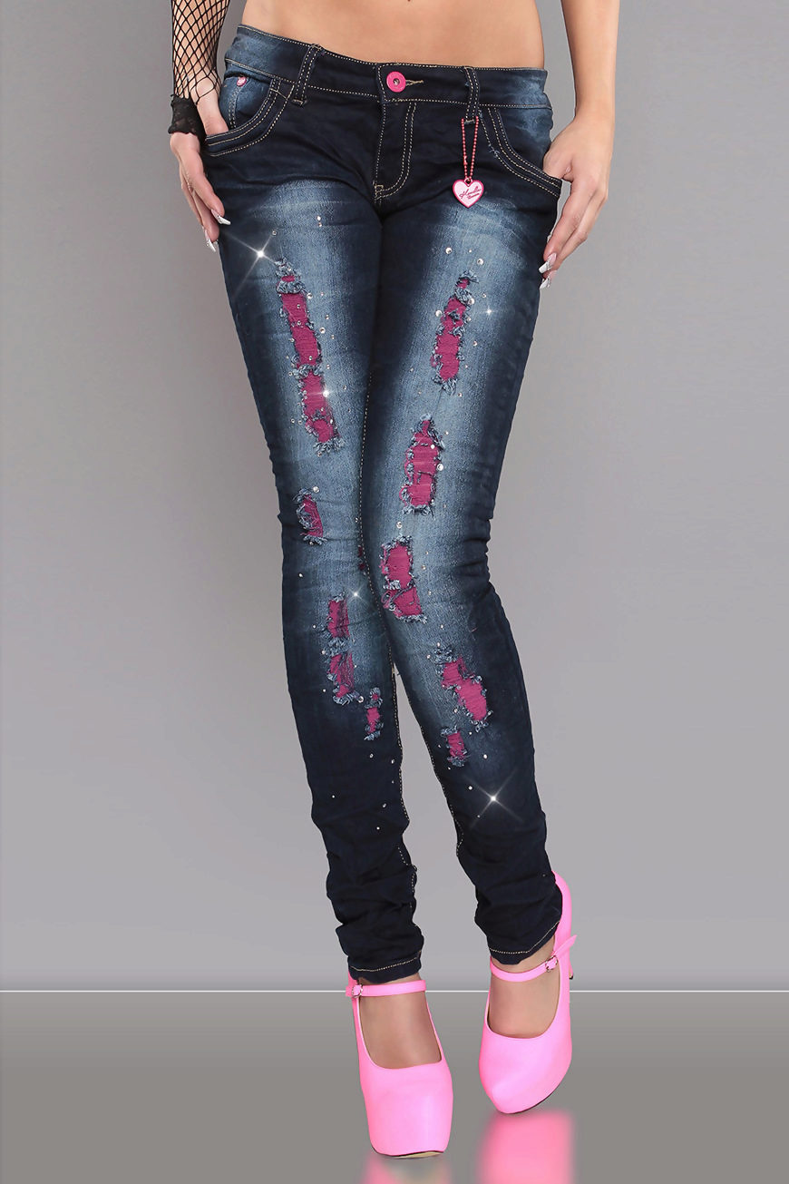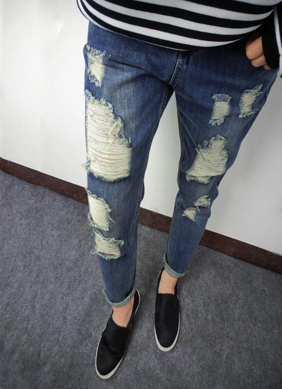 Trousers with shaped cuts and cuts - through them visible bare skin. In these "blown" pants is not terrible heat.