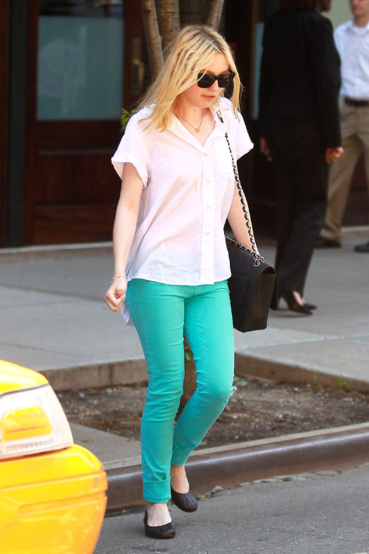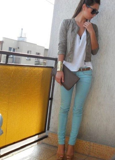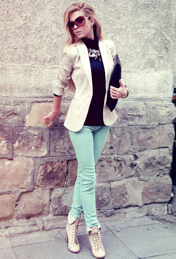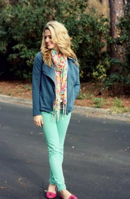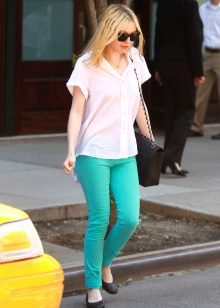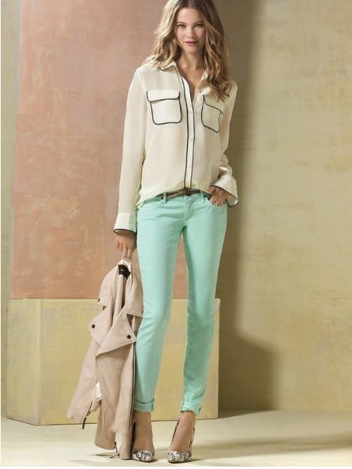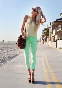 Pants of this color in spring and summer are very popular. They suit both blondes and brunettes. The main thing is to choose your shade. Blondes fit lighter shades, and brunettes - darker, with the addition of green.