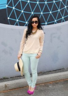 Mint pants + striped sweater. A striking image, bundles, is complemented by a striped jumper worn on a black blouse with small polka dots. The emphasis is on a bright pink jumper element. We complement the image of accessories. Shoes - beige high-heeled shoes.