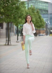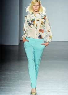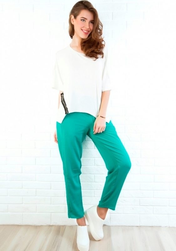 The top can be worn any type. This may be a T-shirt or top, or maybe a blouse made of thin fabric. Combinations from mint trousers and loose-fitting silk or chiffon blouses look great on girls. The top can be decorated with special details - interesting sleeves, lace fabric, unusual collar.