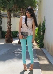 Mint trousers + a blouse with a flower print. Another one of feminine images. In case you are tired of monophonic things. You can choose the top with a low-key print. For example, a sleeveless blouse with an elegant floral print. Bag and sandals - neutral uvetov.