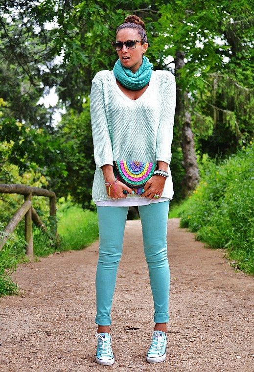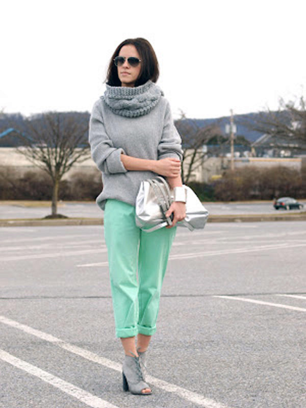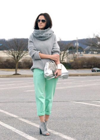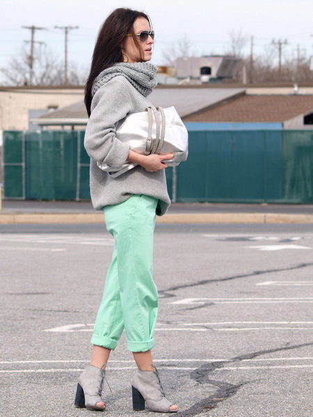Mint pants + gray. This is a trend. Which we have already noted - a combination with gray. Trendy beggy pants in combination with a voluminous gray sweater.