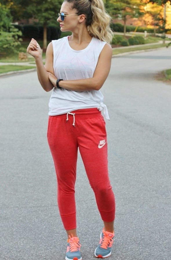 Light gray Nike loose trousers in combination with a contrasting tank top and glamorous sneakers will help in creating a sport chic look.