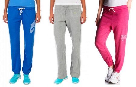 The company Nike has available many models of sports pants for women, the main ones: classic withloose, leggings, with stripes and inserts, with elastic or cuffs at the bottom and warmed.