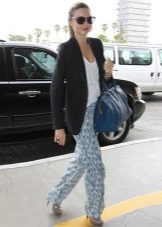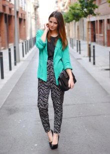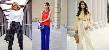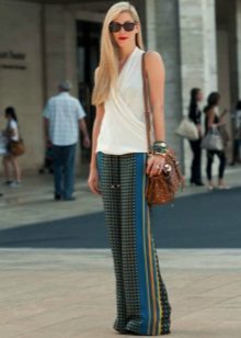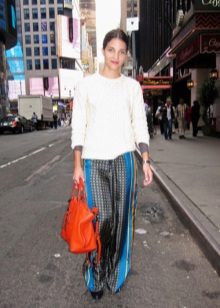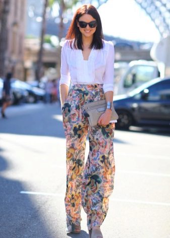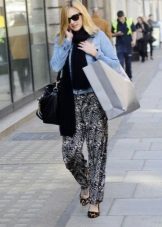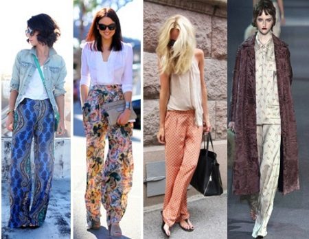 Pajama-style narrow trousers are well combined with a waistcoat waistcoat, a jacket with sequins or a leather jacket-leather jacket worn on a simple solid-colored top. Wide floor-length trousers with bright catchy patterns look good with loose sweaters. In the evening - with beautiful fitted blouses. A satin “pajama” jacket of the same color as the trousers will help to maintain the glamorous look. The obligatory touch of the evening ensemble is elegant shoes with heels and a spectacular clutch. For a romantic meeting, we recommend to choose shortened trousers, classic ballet flats and a light blouse made of natural silk.