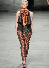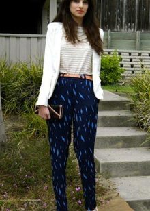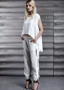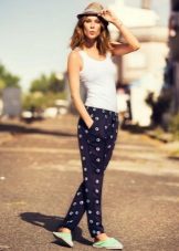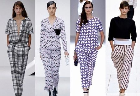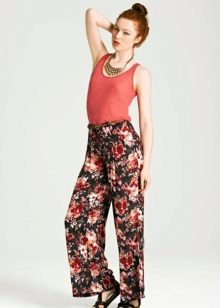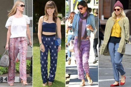 Pants in a pajama style can be found extremely diverse models: straight and wide from top to bottom, slightly narrowed to the bottom and even completely narrow, tight-fitting. At these trousers there is an elastic belt or an elastic band, sometimes only behind. “Pajama” trousers are tied up, as a rule, with laces or, less often, buttons, like usual trousers, are fastened with a zipper or a button. The top is selected according to the pajama style pants.