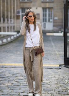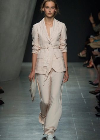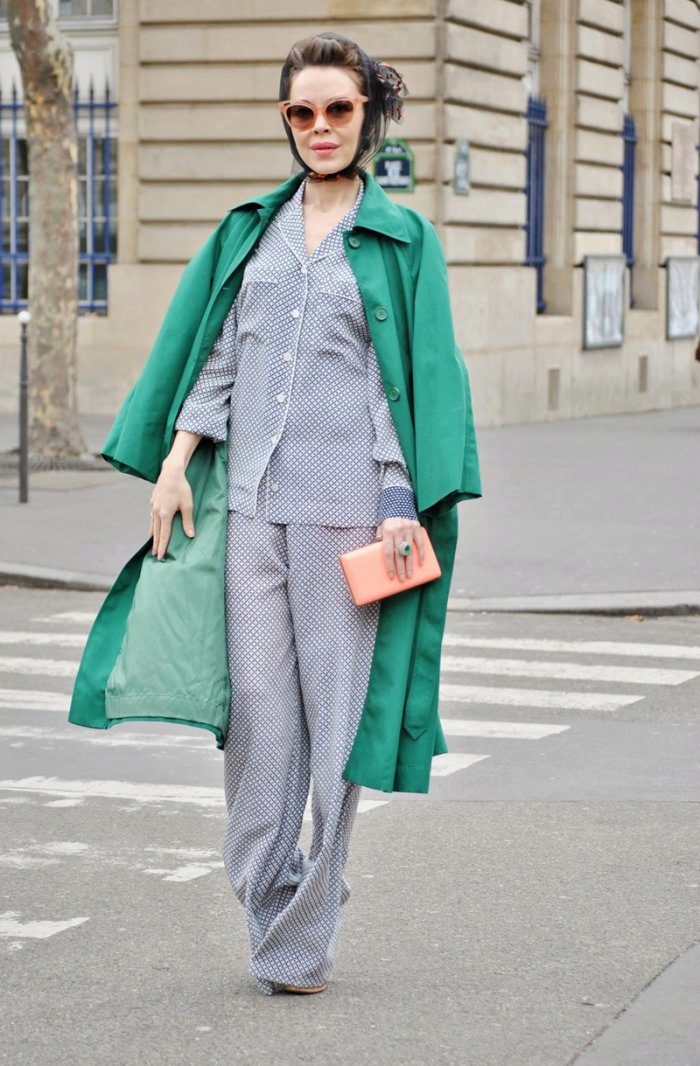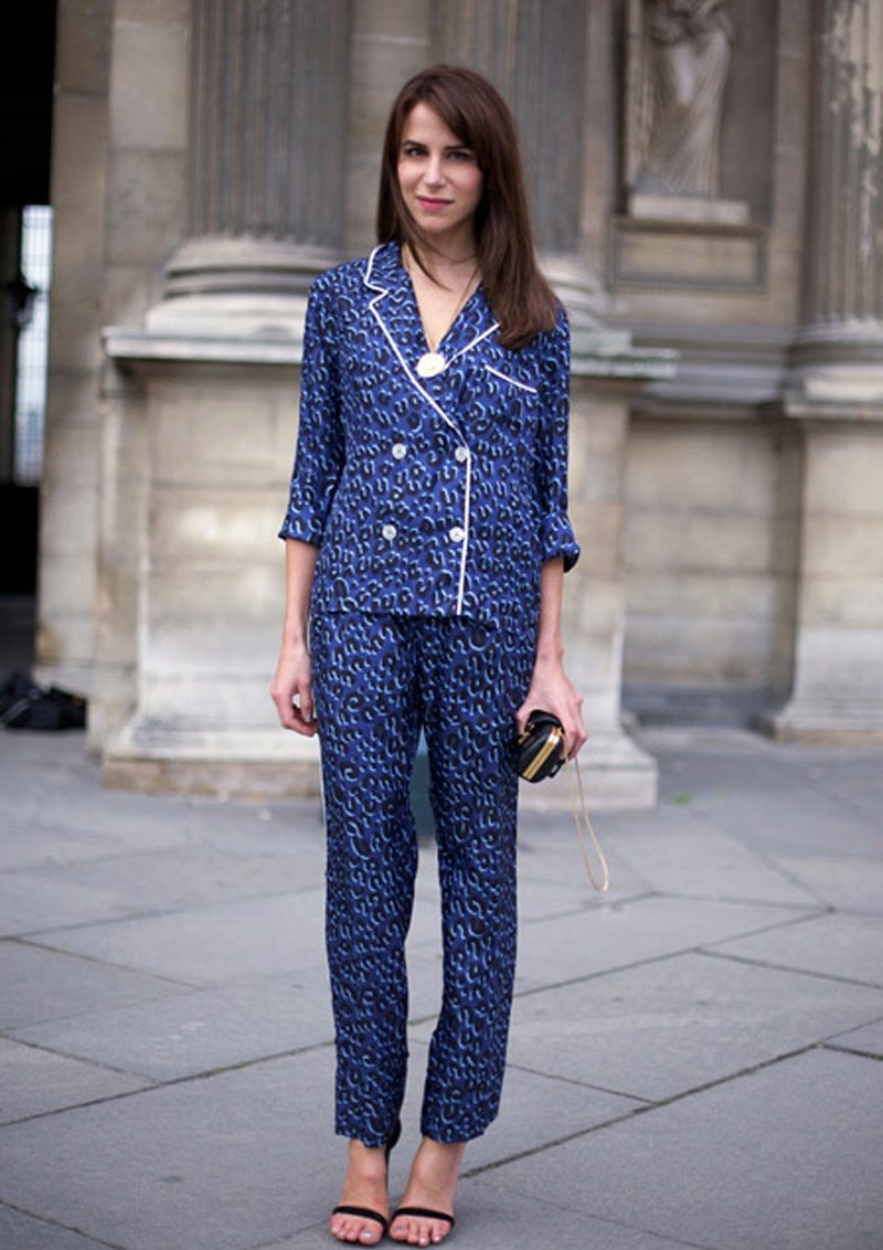 Monochromatic shirt, or top, tucked into “pajama” trousers of soft colors, will give the appearance of a business image, and if you include in this set a classic long jacket, you can not hesitate to go in this form to work. Stiletto heels or classic pumps will add elegance to your look. A coat overlaid on top and a steady clutch will complete the image of a self-confident business lady.