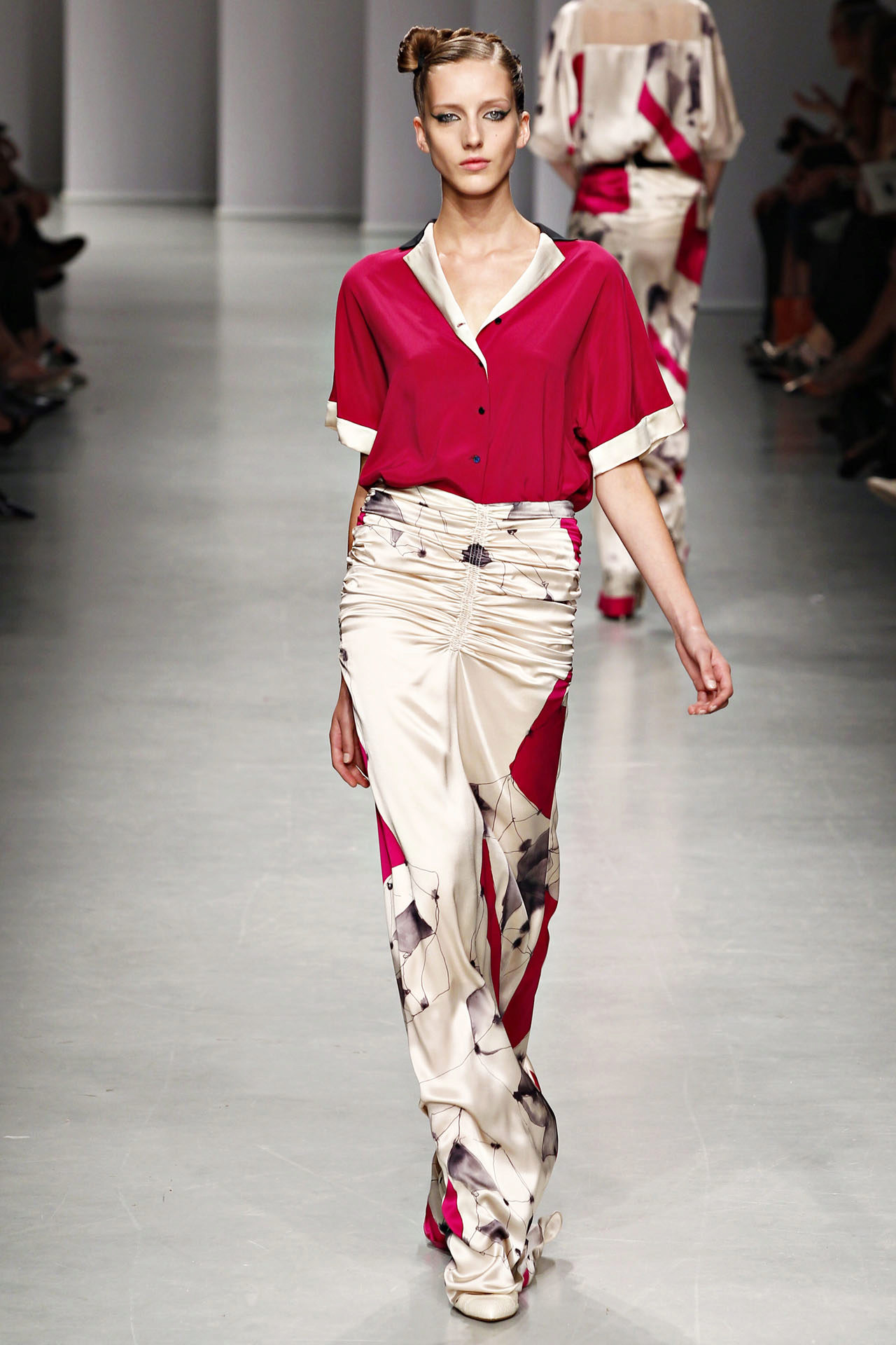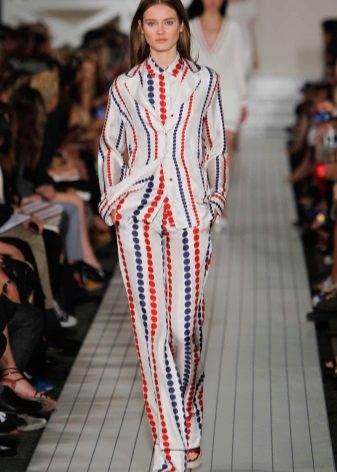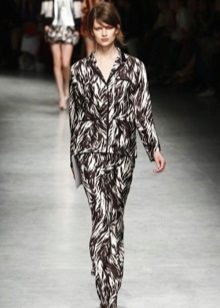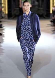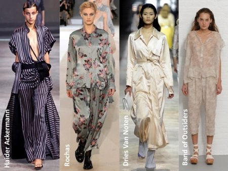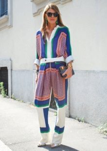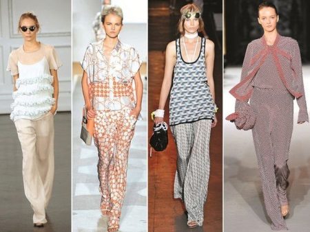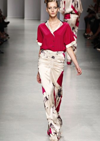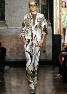 In the latest shows of collections of eminent designers, sets appeared entirely imitating pajamas: wide loose pants and a straight spacious shirt, sewn from thick silk or satin, both in monochrome and in print.