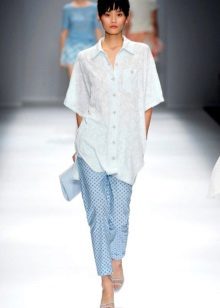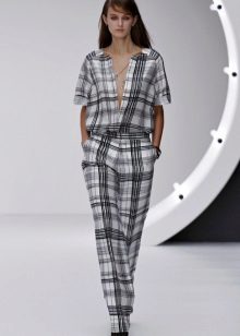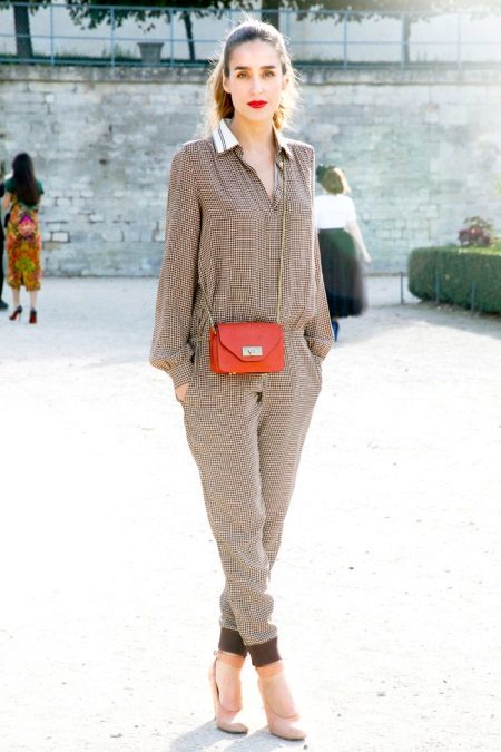 Do not neglect the selection of the top with a print under the colors of your "pajama" trousers. The combination of skinny trousers and shirts with the same pattern, for example, in a cell, will make an impression of a jumpsuit popular this season. The shirt should be tucked into the pants.