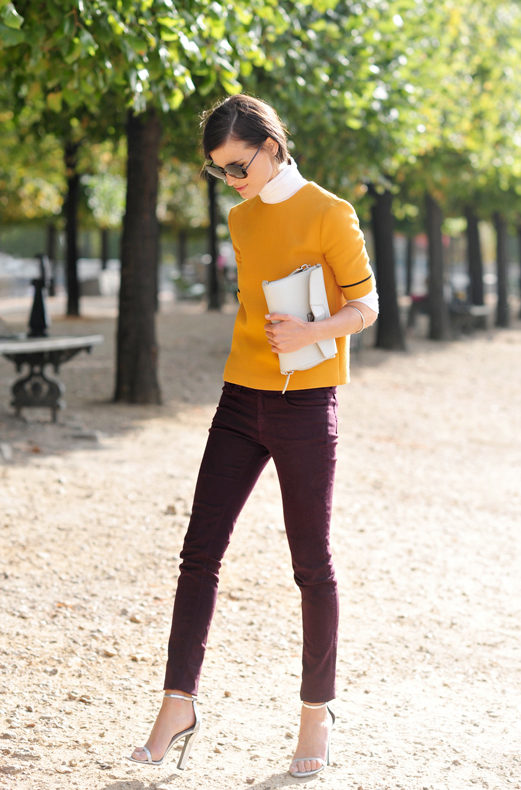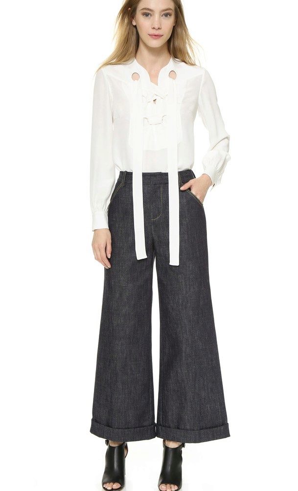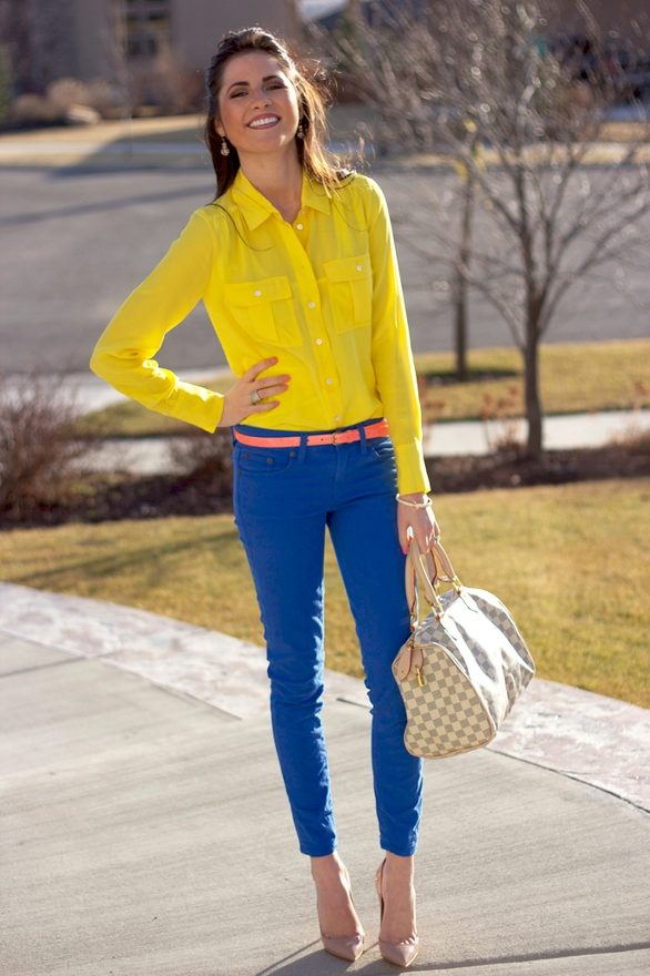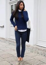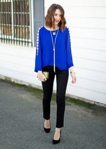 Blouses, T-shirts, blouses and turtlenecks in white, pale blue or yellow will look good with blue trousers.