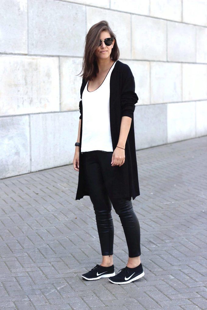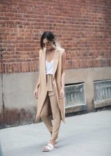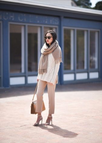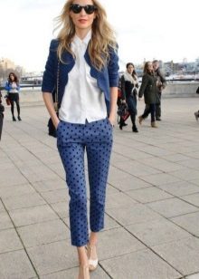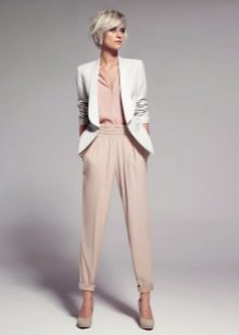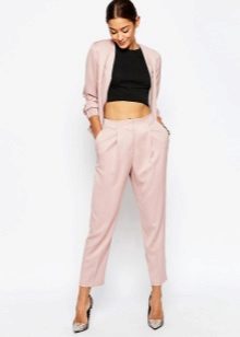 The set, selected in monochrome colors, will also look great. The presence of arrows on the trouser legs and high heels will also help make your legs visually longer and slimmer.