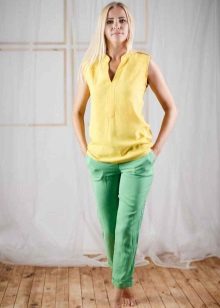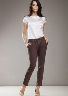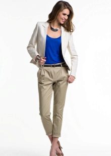 An office with straight ankle trousers should be worn with a strict blouse, jacket, court shoes and modest accessories. On vacation summer pants 7/8 will look great with long light tunic. Classic pants on the ankle of a denser fabric are suitable for demi-season weather - in the cool they can be combined with loose pullovers and cardigans, and if necessary, supplemented with a windbreaker or a park.