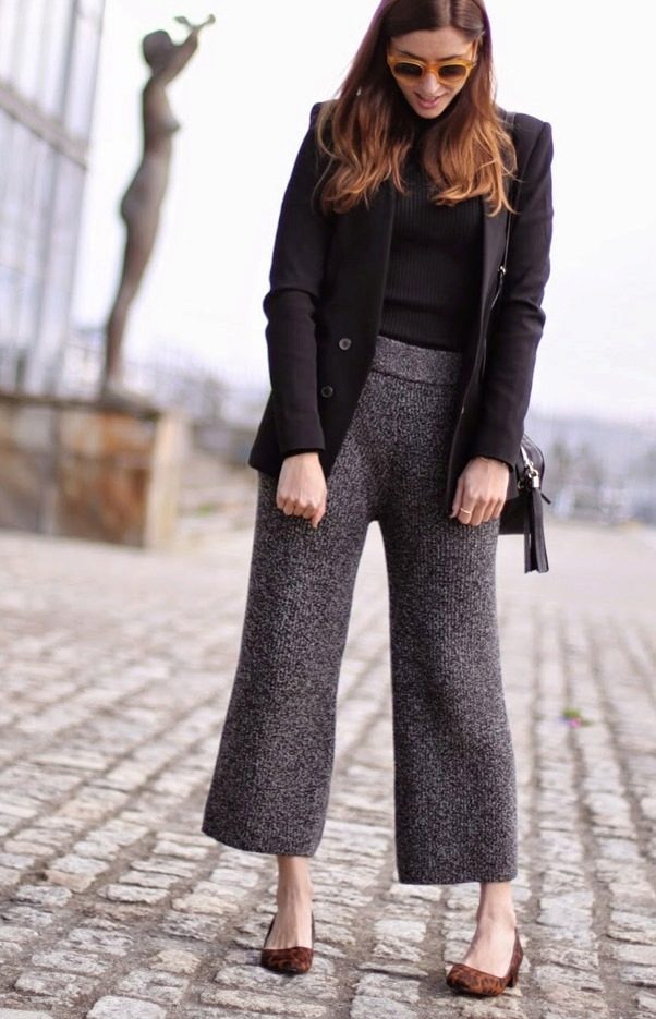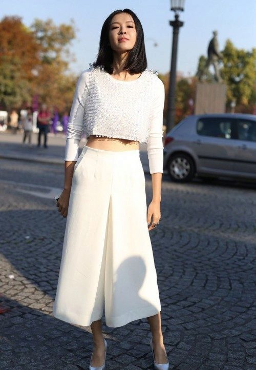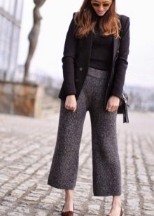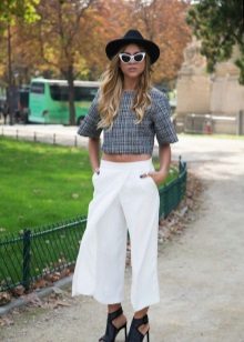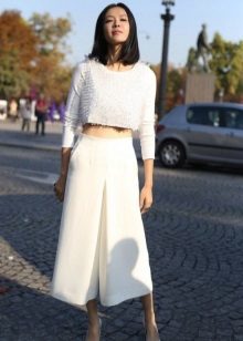 Culottes. This model of wide trousers, externally similar to a midi skirt, can be almost straight or extended, with a length slightly below or slightly above the middle of the calf. Looks great only on mannequins, the rest can be advised to try on culottes up to the ankle length or slightly above it.