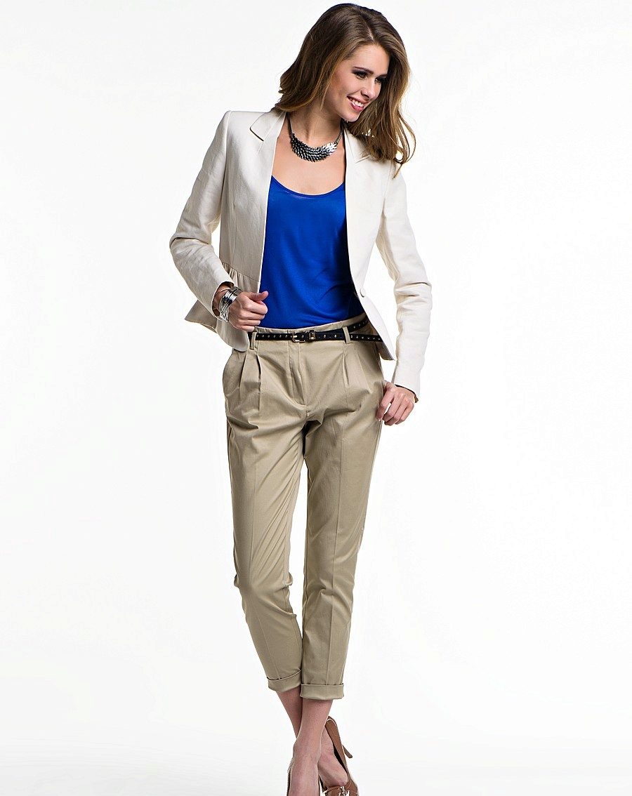The chinos ankle style can also become an indispensable variant of trousers for magnificent ladies. In order to avoid giving excessive thighs massiveness, you should give preference to pants with not too deep folds and tucks, but usual darts on the belt.