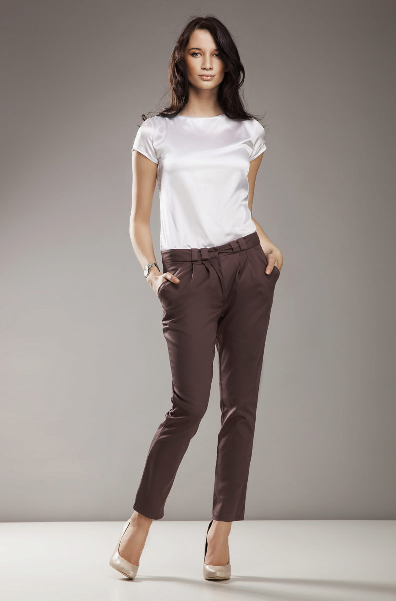 Straight ankle trousers with arrows and small cuffs fit only slender young ladies. Pants of 7/8 straight cut, dark monochromatic colors will help to create an image of a successful and confident business woman.