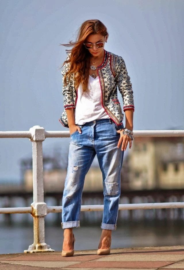 Jeans boyfriends - a popular model with trouser legs, turned up just above the ankle. Classic "boyfriends" usually without tucks and folds at the waist. The easily recognizable shape comes out at the expense of a rather low waistline and tapering legs.
