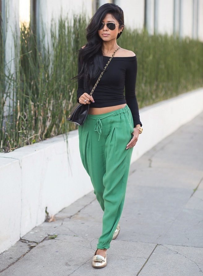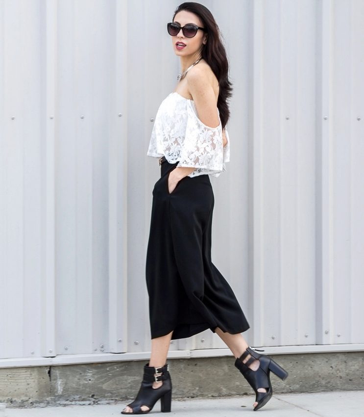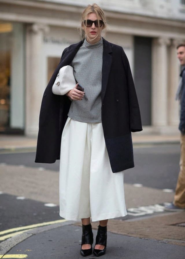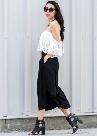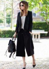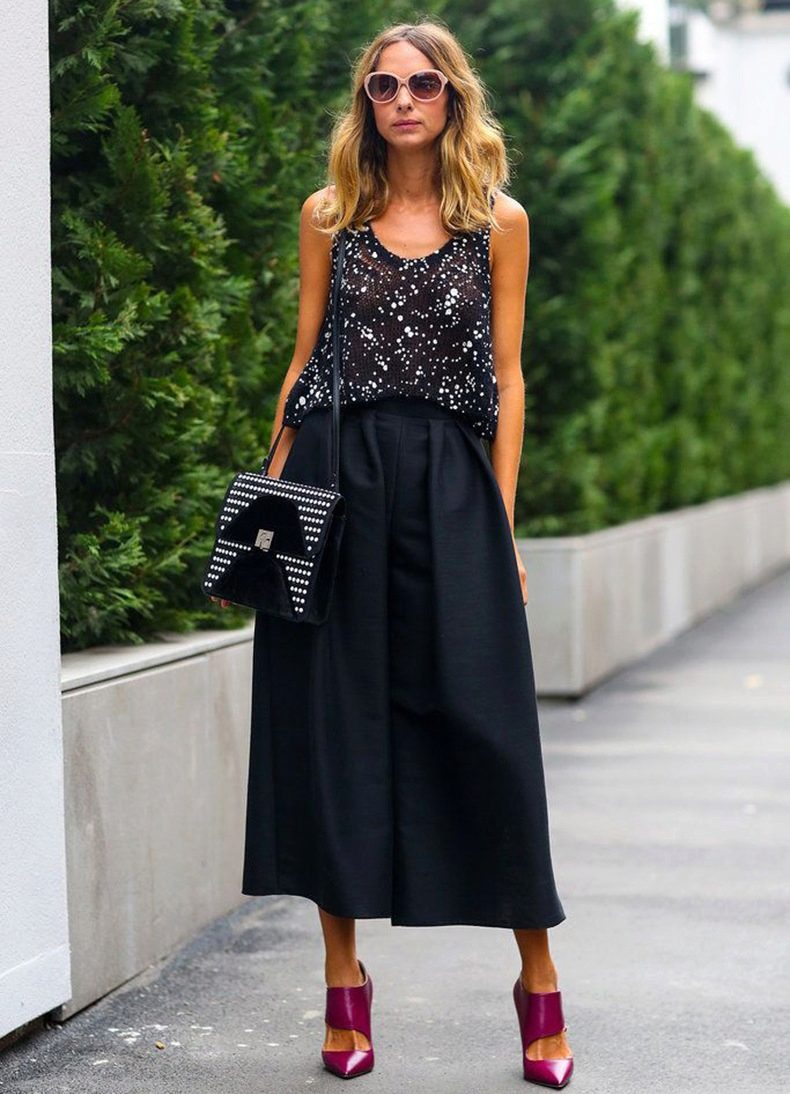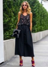 One more bright style are culottes, which have the features of wide pants and skirts. Usually they have a length slightly below the knee. This style should be combined with a fitted top - tops, turtlenecks, fitted blouses and jackets.