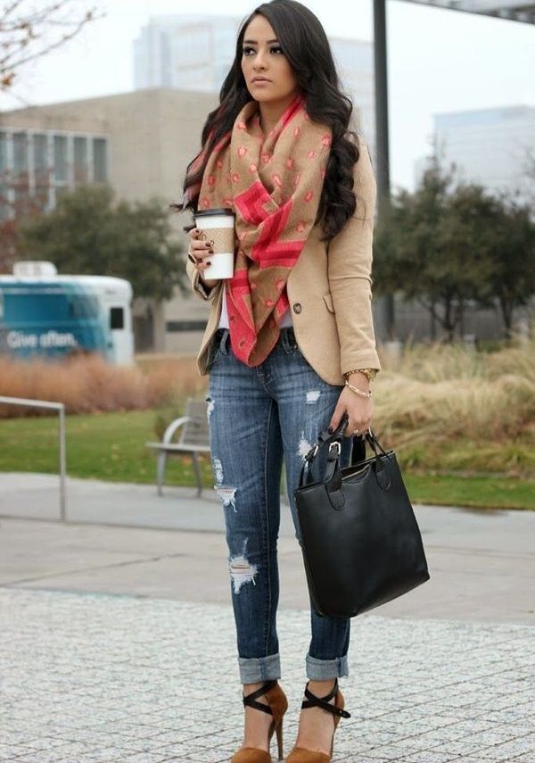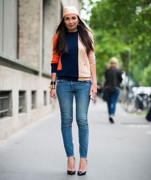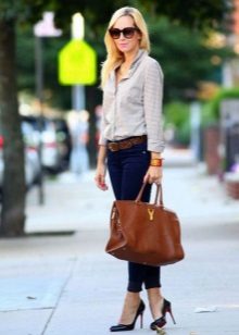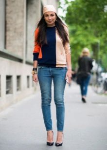Jeans are a good solution for the embodiment of a stylish bow in casual style. Many girls combine jeans with a sweatshirt or a blazer, and complement the image of sneakers on a wedge.