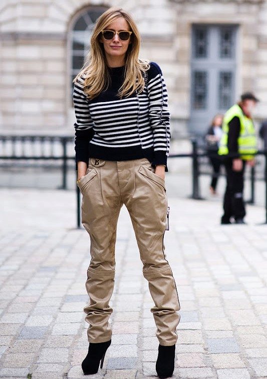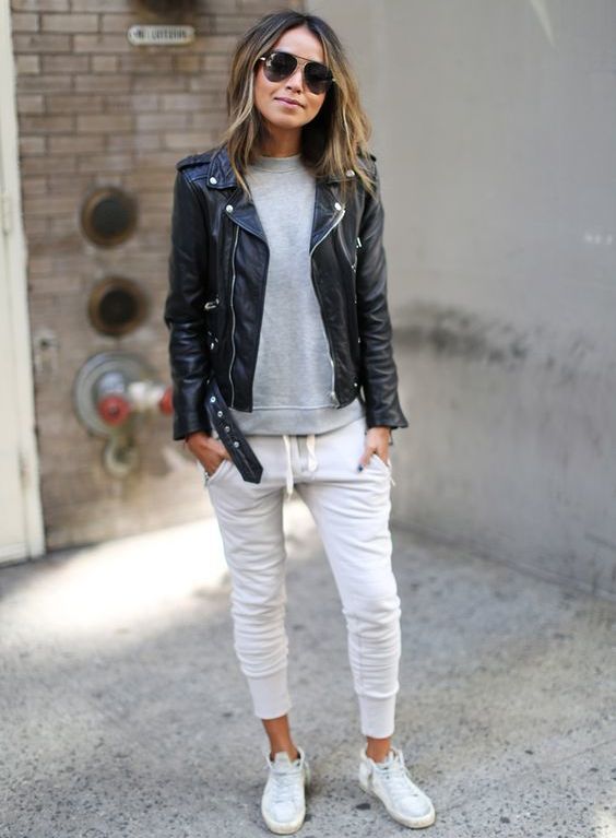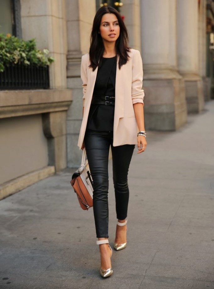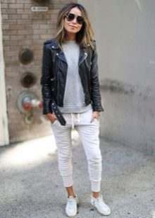 Lovers of comfortable shoes can combine your favorite sneakers with black leather trousers. A white t-shirt with a black horizontal strip will perfectly fit into a trendy look, and a light coffee classic jacket will add a bow of elegance. A bag with a decor to match the trousers will help to complement the stylish look.