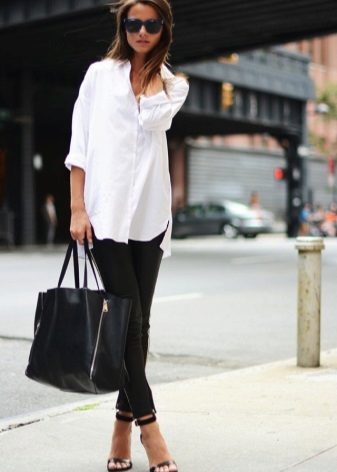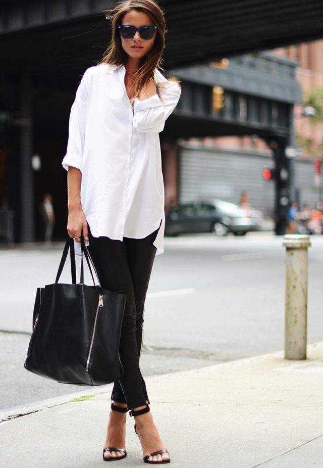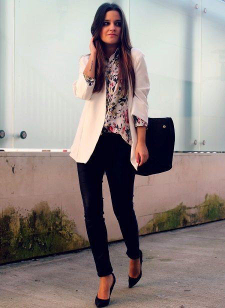 Black tight fitting trousers can be combined with a classic shirt, decorated with a floral print. A white jacket can be worn over the top. Stiletto heels and a roomy handbag on the shoulder to match the trousers will elegantly complement the stylish casual bow.