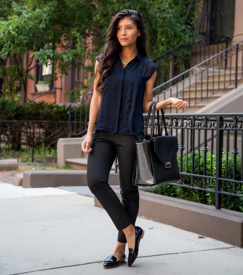 Black trousers of shortened length in a tandem with a semi-transparent blue blouse look feminine and elegant. Comfortable loafers and a spacious bag to match the trousers will be the final elements of the irresistible casual bow.