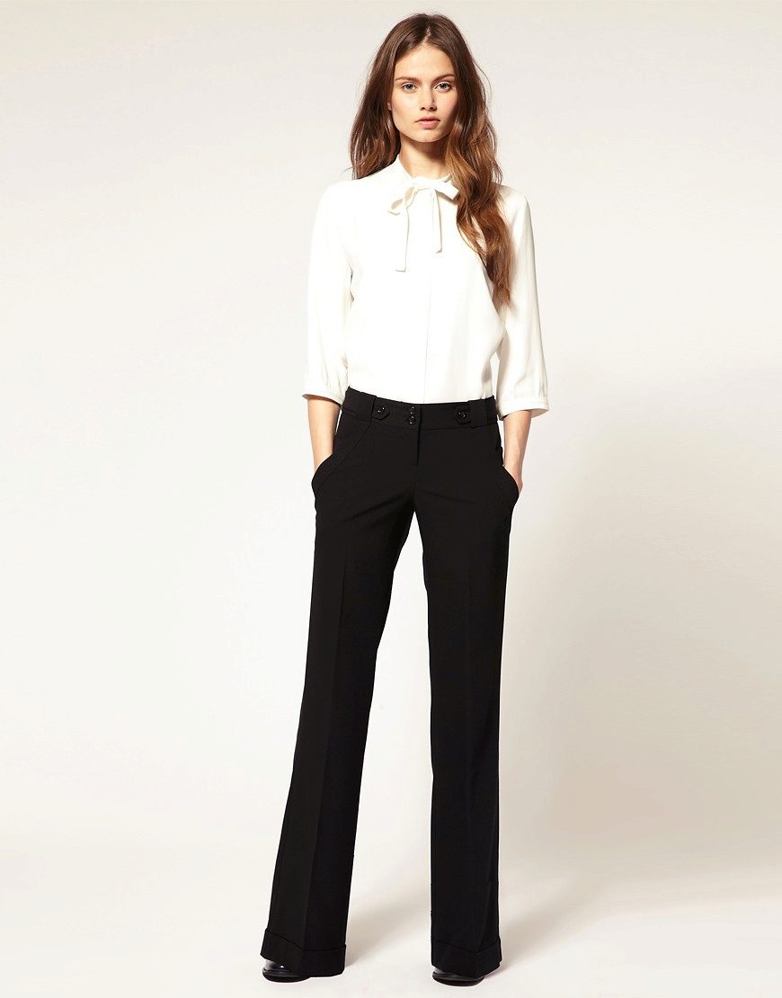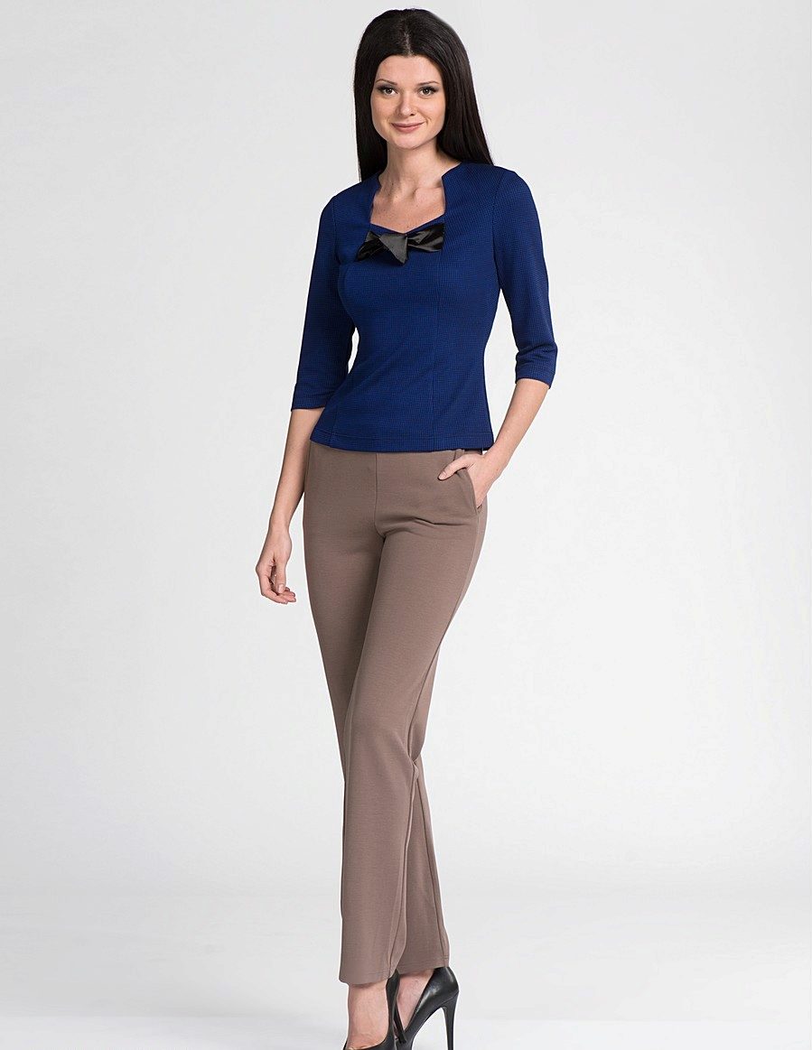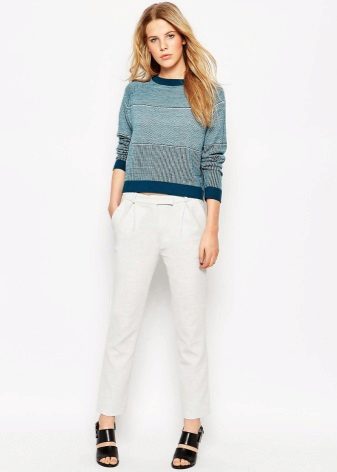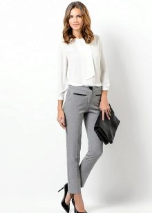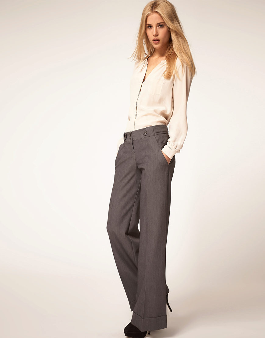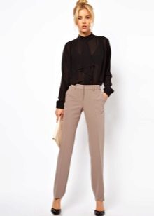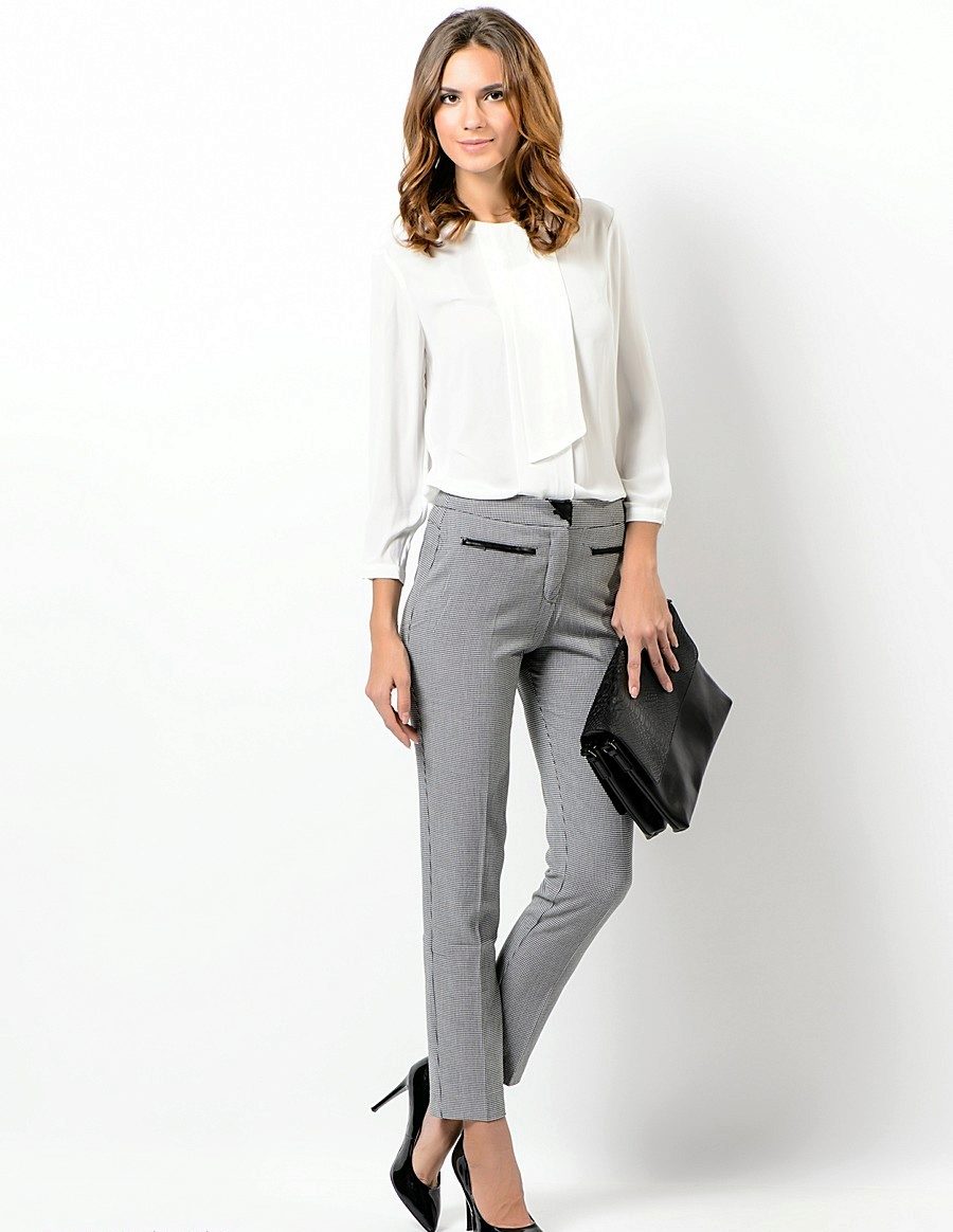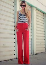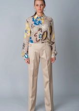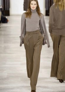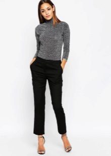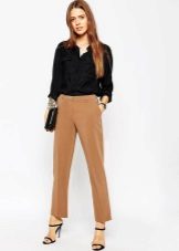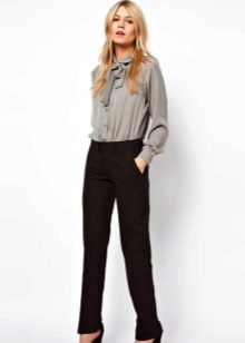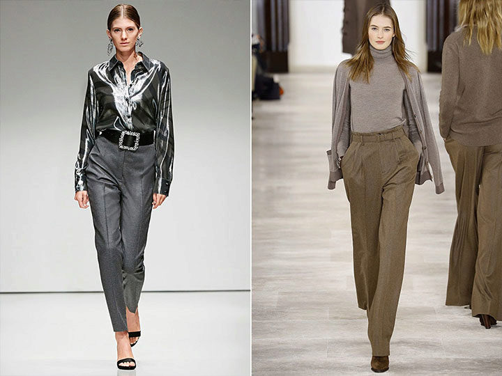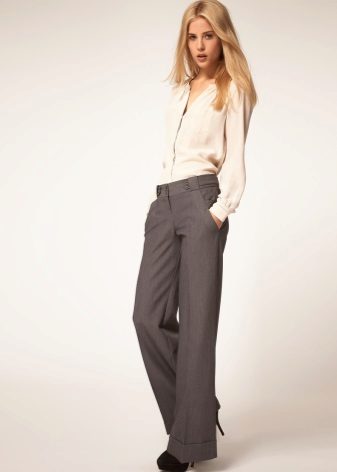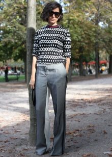 The classic model of wide trousers with straight cut with arrows will be perfectly combined with tight knitted blouses, with a v-neck. The image turns out to be classic and fits perfectly into the framework of the office dress code, without being knocked out by any details. The version of a blouse tucked inside will look most successful; then, perhaps, it will be relevant to use a thin black strap with a silver buckle.