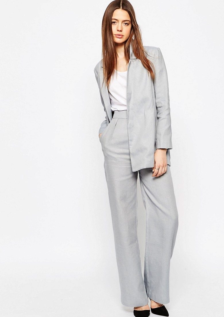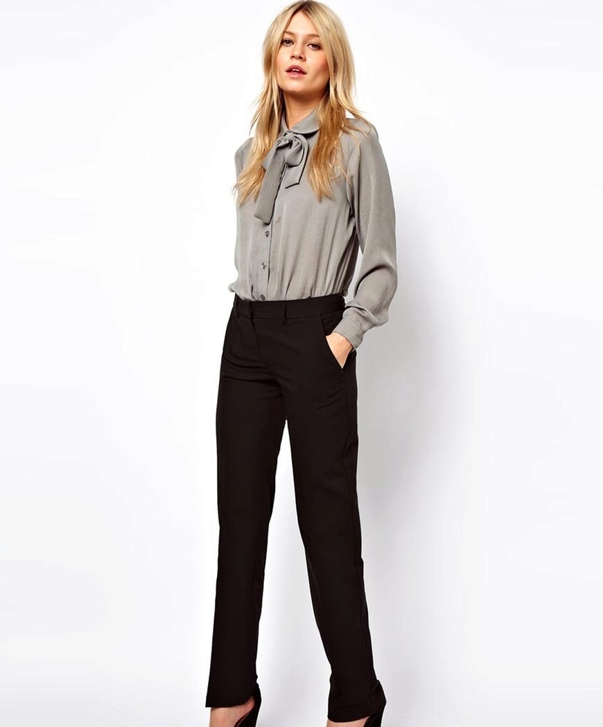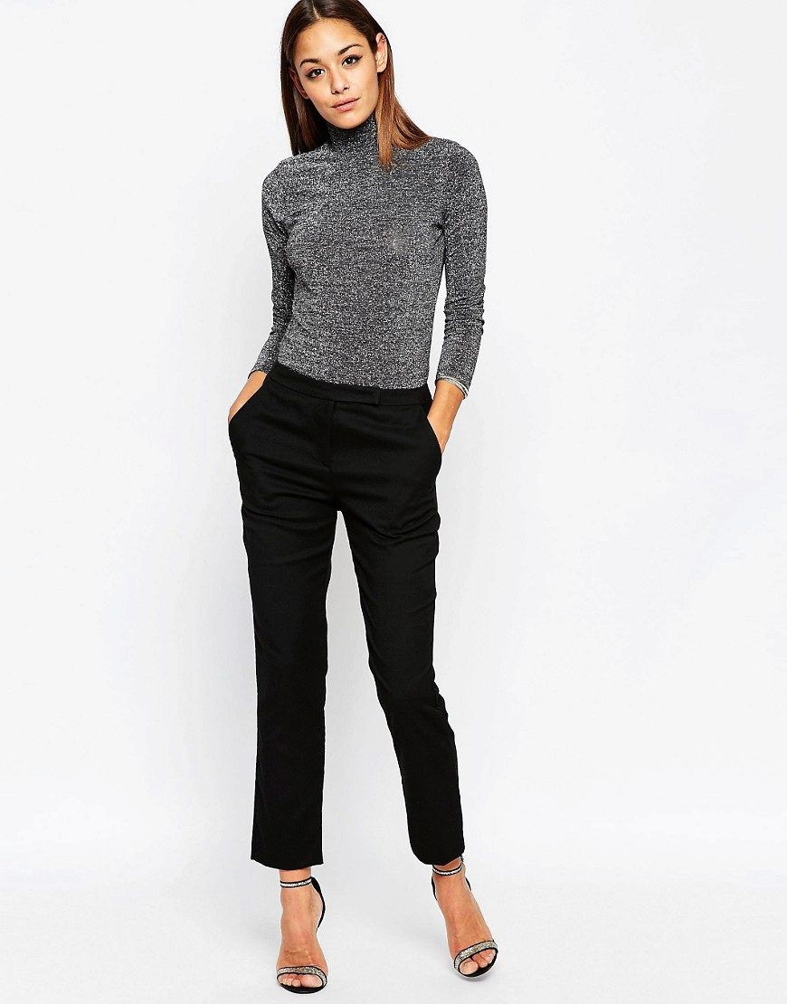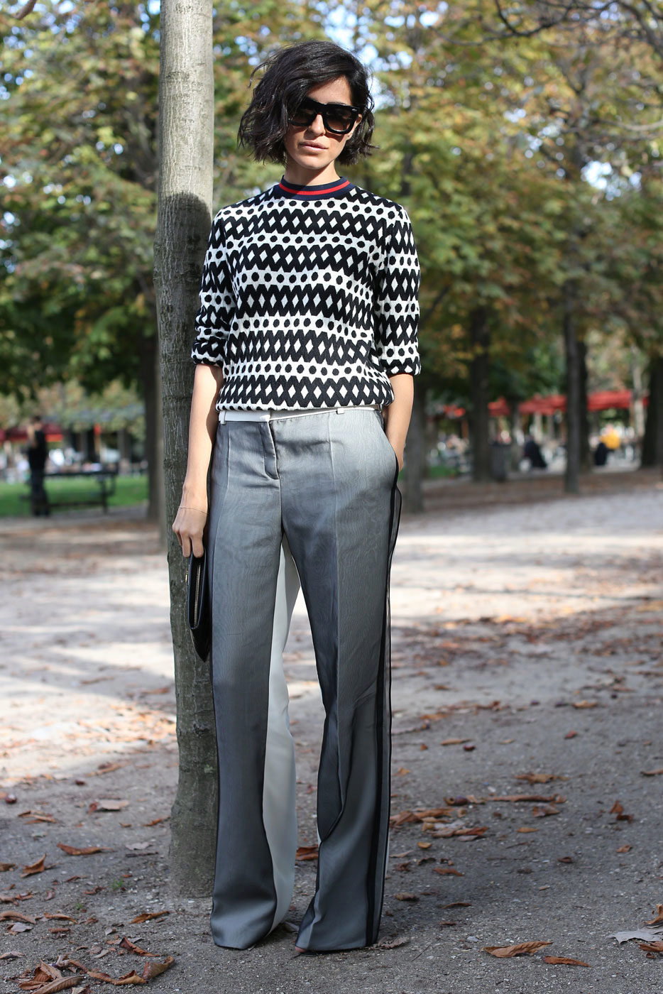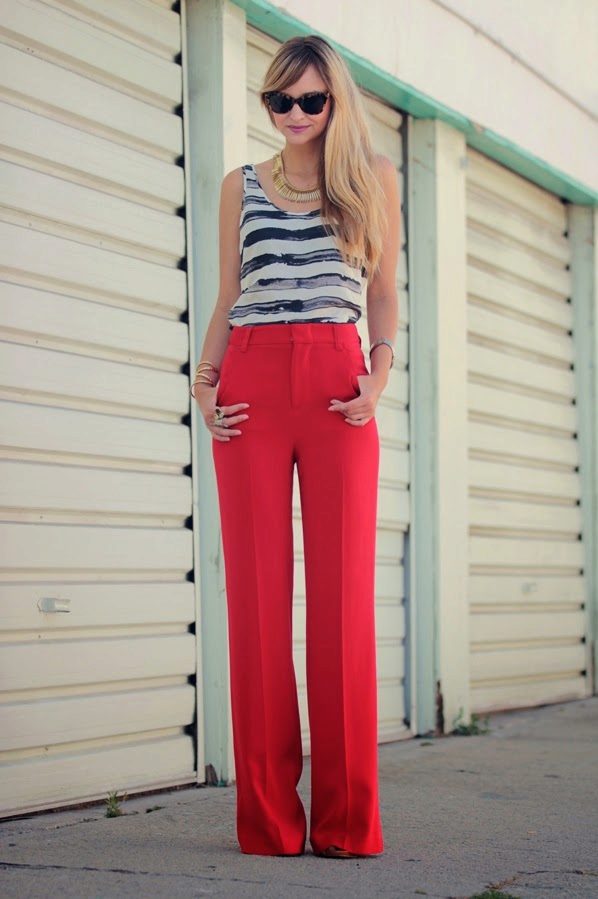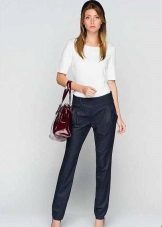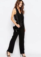 The classic model of wide trousers with straight cut with arrows will be perfectly combined with tight knitted blouses, with a v-neck. The image turns out to be classic and fits perfectly into the framework of the office dress code, without being knocked out by any details. The version of a blouse tucked inside will look most successful; then, perhaps, it will be relevant to use a thin black strap with a silver buckle.