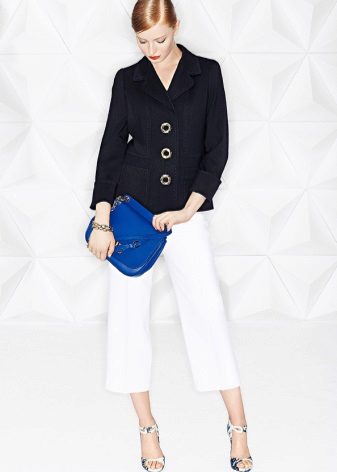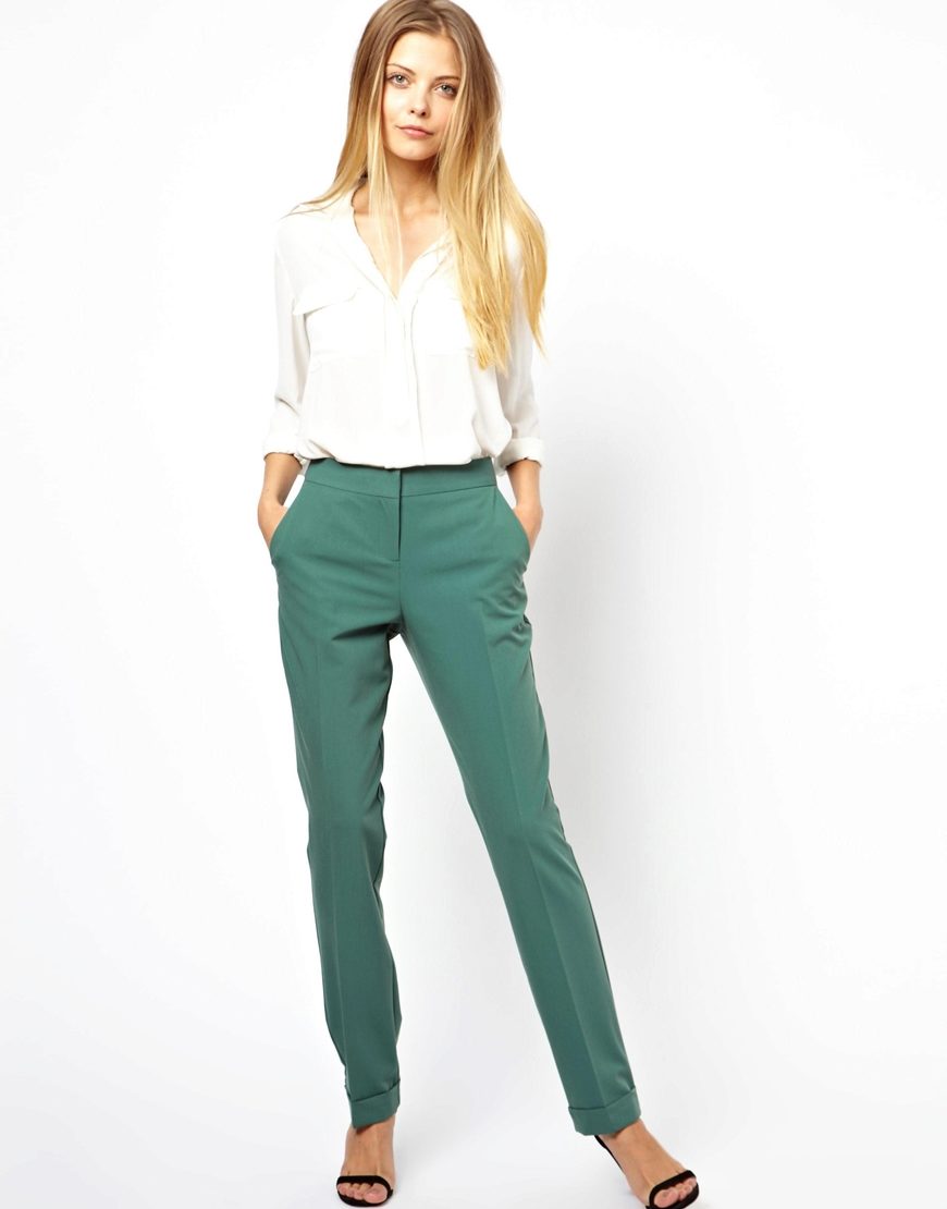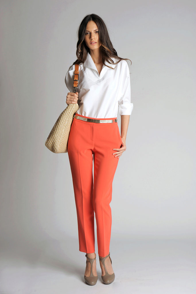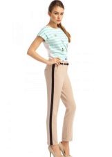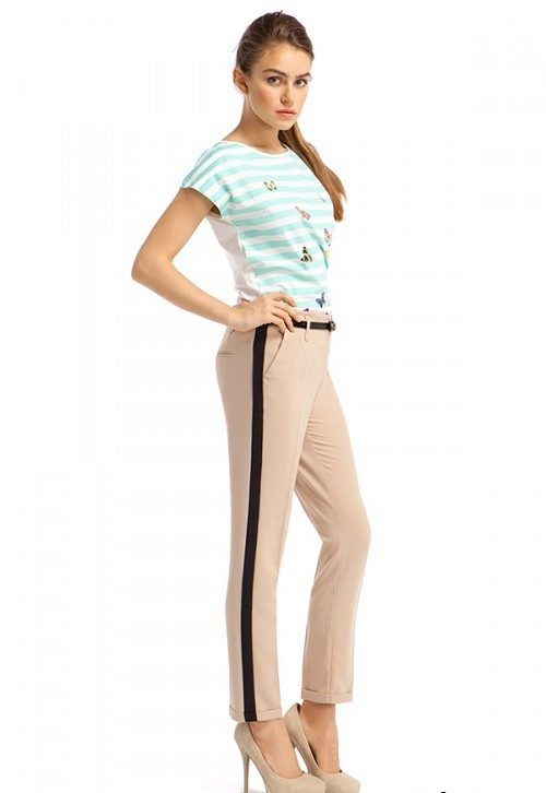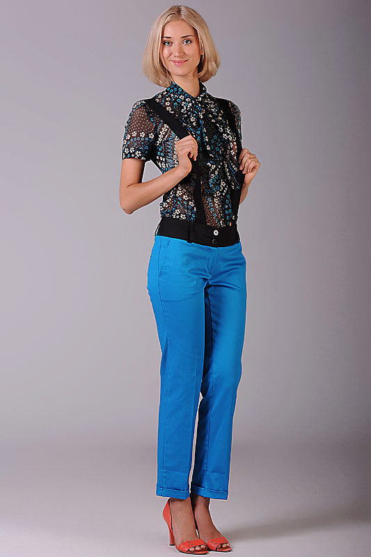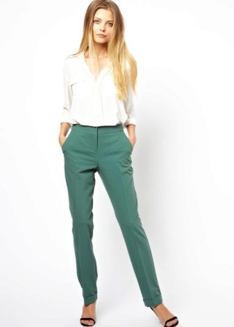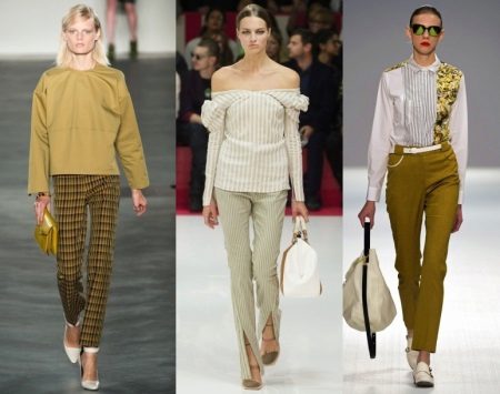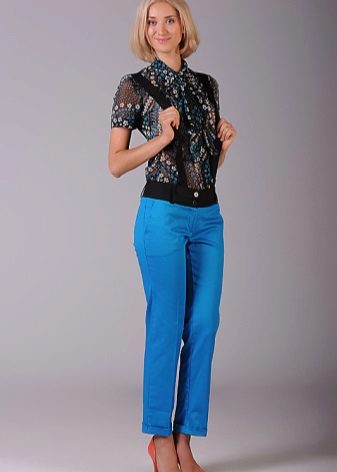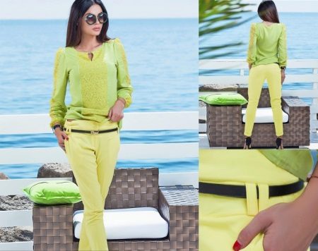 An excellent option for summer apparel will be tight, straight-cut, lemon-colored trousers with cuffs tucked at the bottom. This model will be perfectly combined with a light pistachio blouse made of silk fabric, with yellow lace inserts. A very unusual solution would be to complement the image with dark details, for example, black high-heeled sandals, a thin leather strap on trousers, as well as a watch, also black.