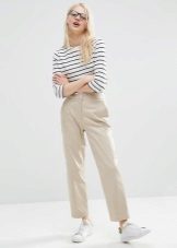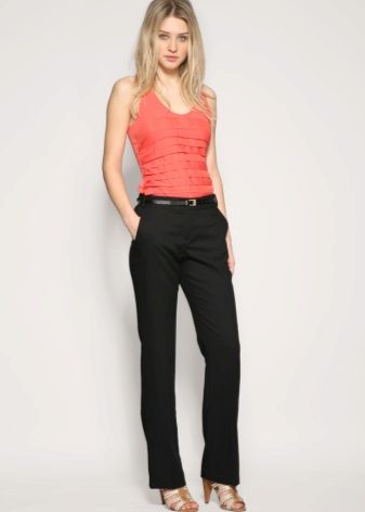 As the top, in combination with straight cut trousers, a variety of options can be used. For example, blouses made of airy flowing fabric, light T-shirts and T-shirts, elegant tops, cardigans, blazers and jackets, as well as various cotton shirts. This model of trousers allows a combination with any clothing options, the main thing is to choose the right part of the wardrobe, in accordance with the event.