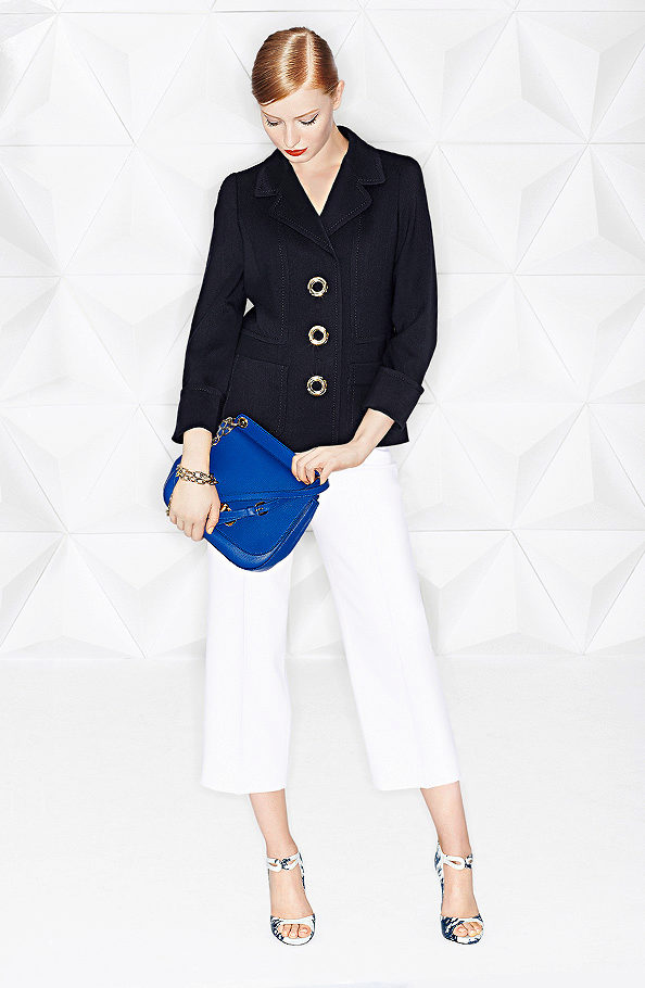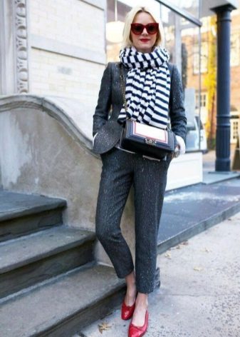 To complement the image will help the elegant black boats and a small bag of a classic model. And so that the image does not seem boring and bland, you can dilute it with bright details, for example, red with earrings in the form of large stones.