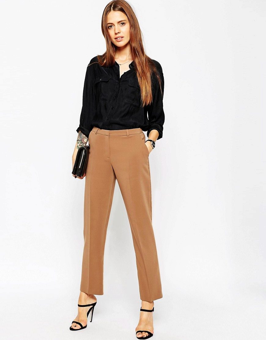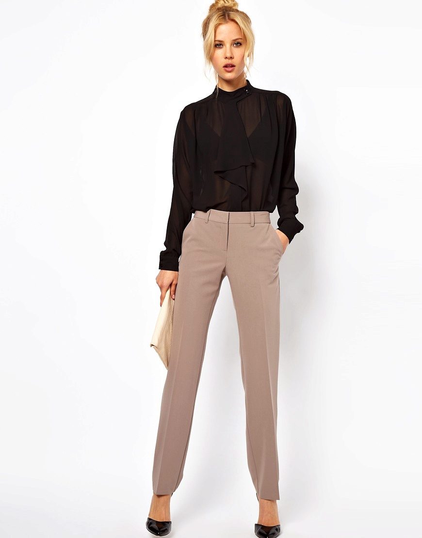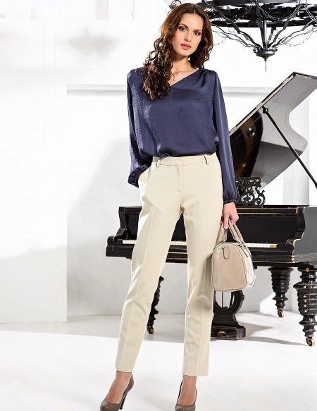 Narrow sand-colored straight-cut trousers with arrows look very stylish. In combination with a lightweight blouse, dark blue, made of fabric that imitates a rumpled look, these pants will look incredibly stylish and unusual. High-heeled shoes the color of coffee with milk, as well as a small beige bag are perfect as complementary parts. This image is perfect for meeting in an informal setting, as well as for a date.