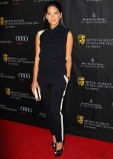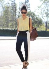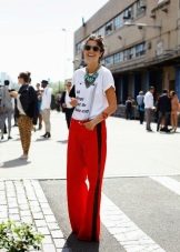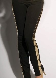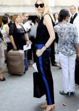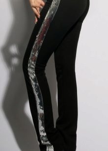 Side strips are often made of other fabric, they can be embroidered or decorated with rhinestones. Competently picked up the top and shoes, pants with stripes of such a plan can even be put on an exhibition or a theater. The top at the same time should be elegant, and the shoes sustained in the evening style.
