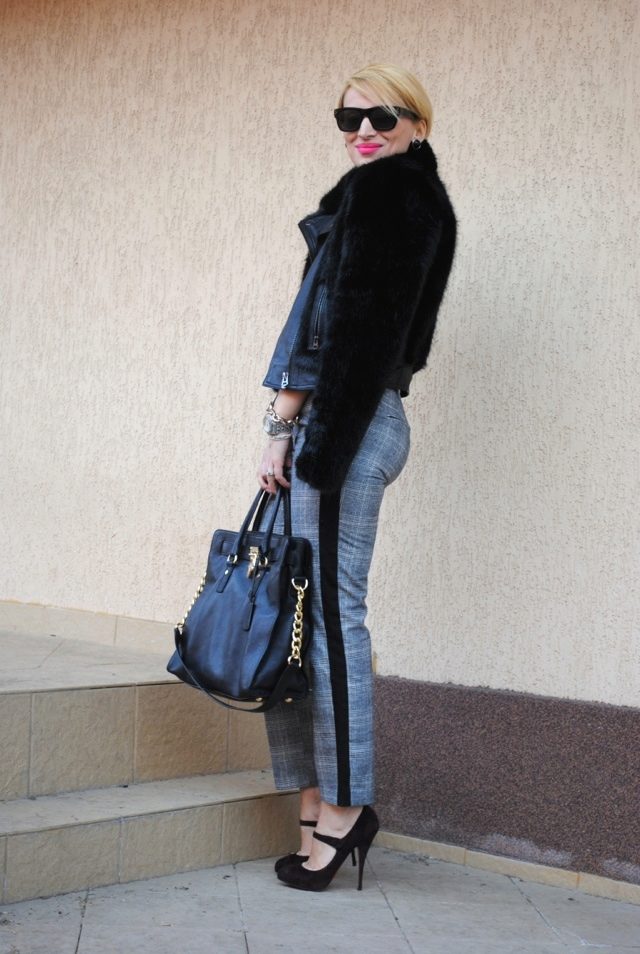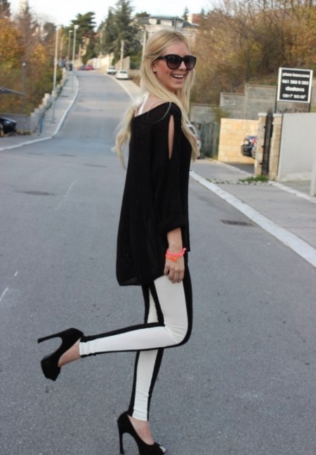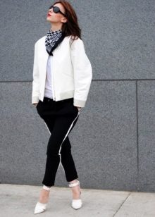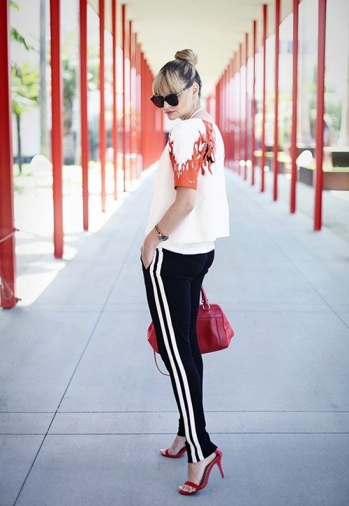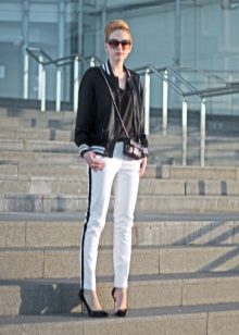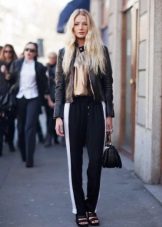 The combination of tight sweatpants with stripes with a blouse made of thin fabric and a cropped black leather jacket or jumper will help create an ensemble in casual style.