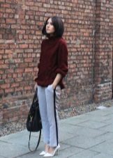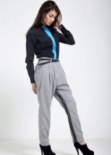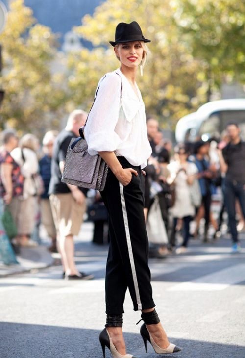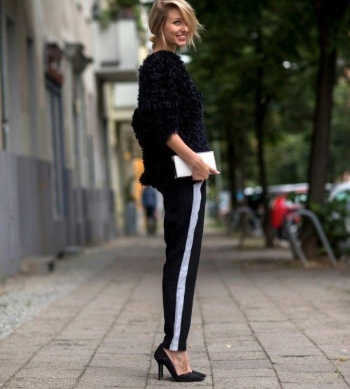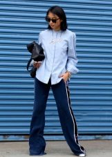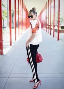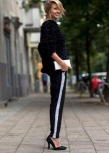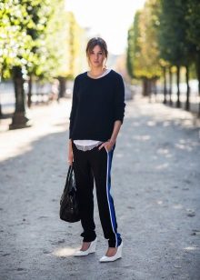 When drawing up images with trousers of such a plan, only one rule should be remembered: do not combine trousers with side stripes and inserts with sneakers; otherwise, fashionistas have a wide scope for bold experiments.