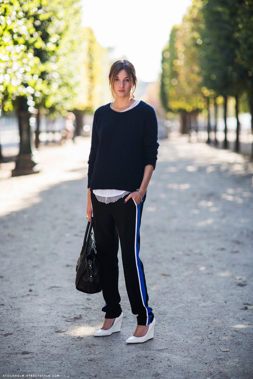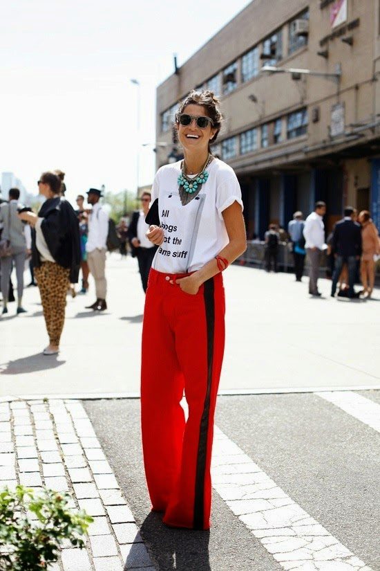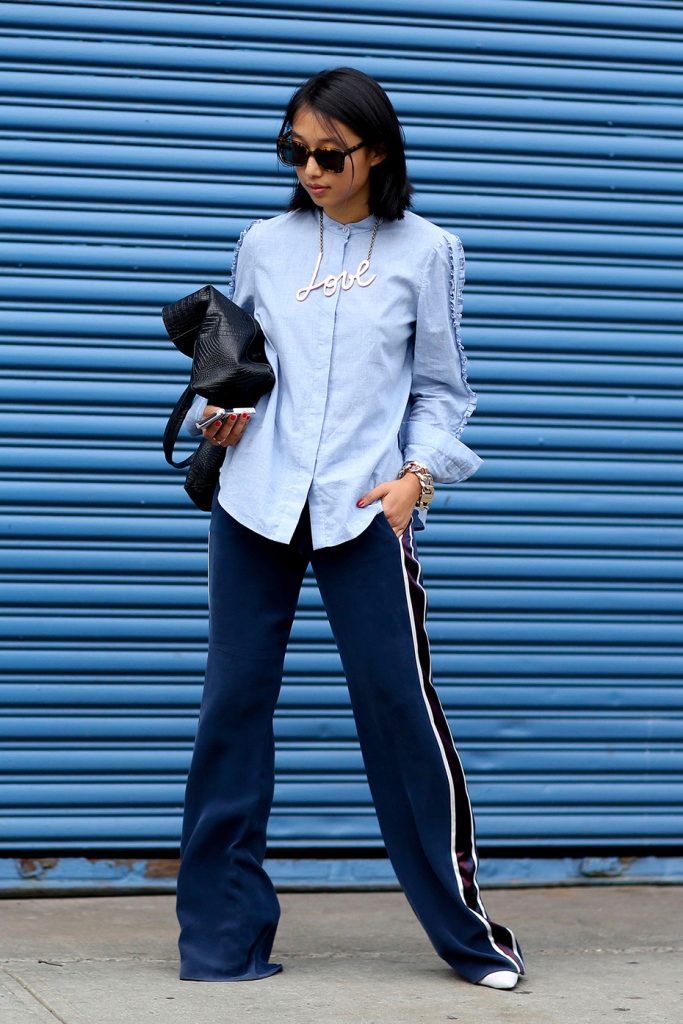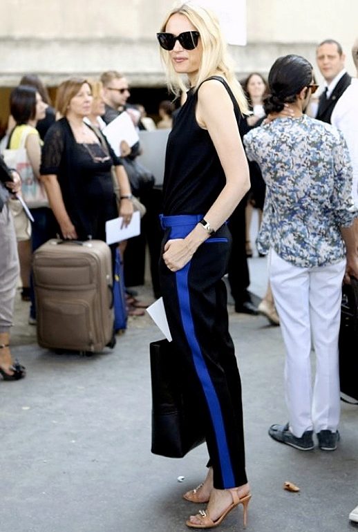The main rule when wearing fashionable trousers with stripes this season is not to forget that this is not sportswear for training.