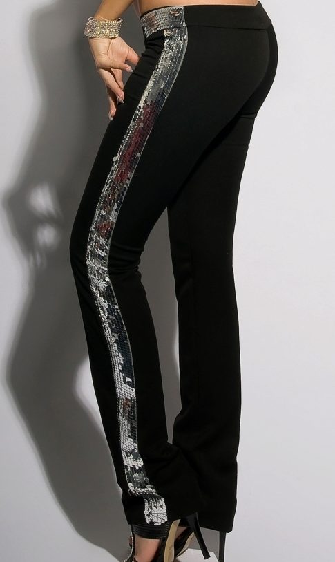 The current trend of the current season trouser fashion is the trousers of gold and silver fabrics: the side stripes of dark colors on metallic look just stunning. Skinny jeans with gold or silver stripes will help to create a no less vivid image.