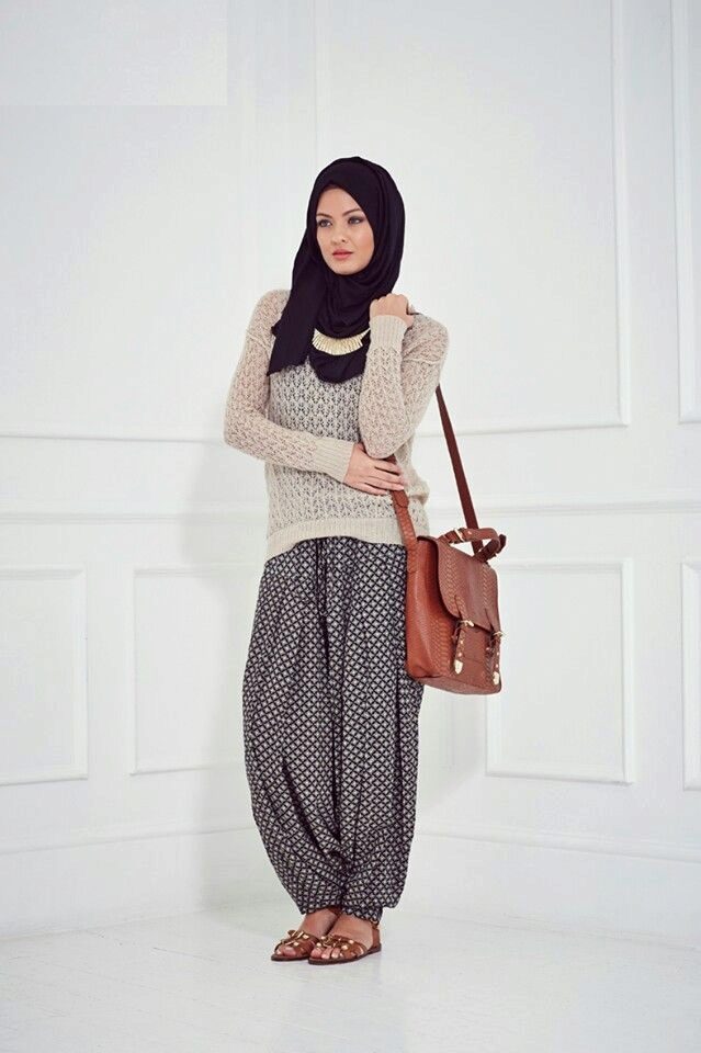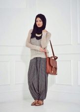 In cool weather, you can wear a top with a sleeve, for example, a jacket, a thin sweater or a denim shirt. To preserve the harmonious proportions of the figure, choose a shortened top for the sharovars. Long tops and blouses can be safely tucked into pants.