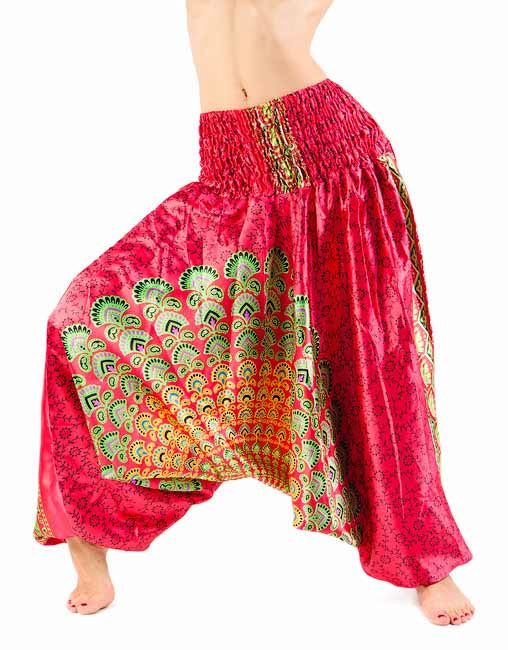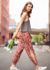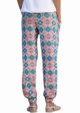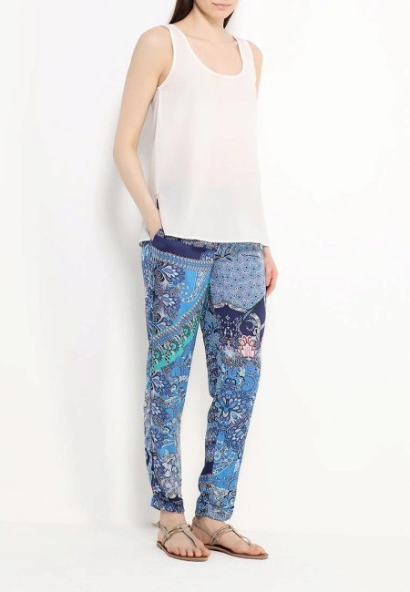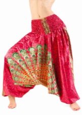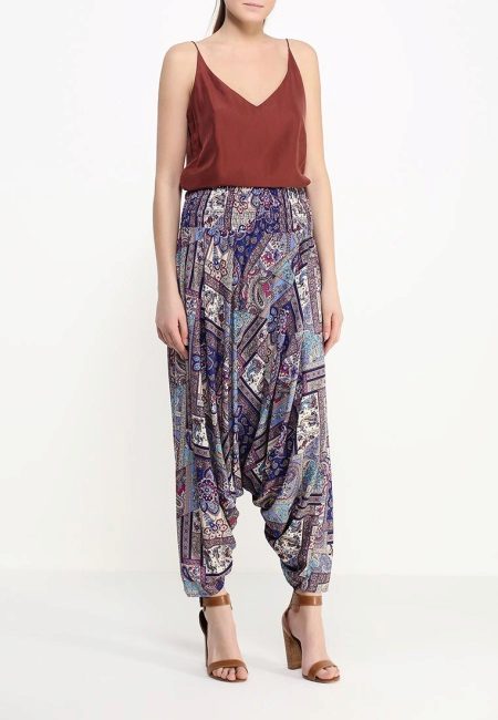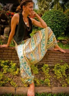 The models of trousers-sharovar of bright, saturated colors with characteristic patterns have a true oriental flavor. One of the most popular ornaments is “cucumbers”, but also birds of paradise, exotic fruits, and other motifs from Arabian tales look spectacular.