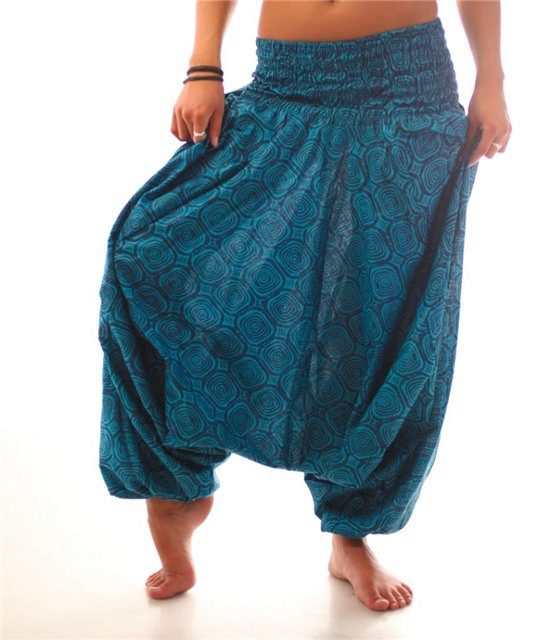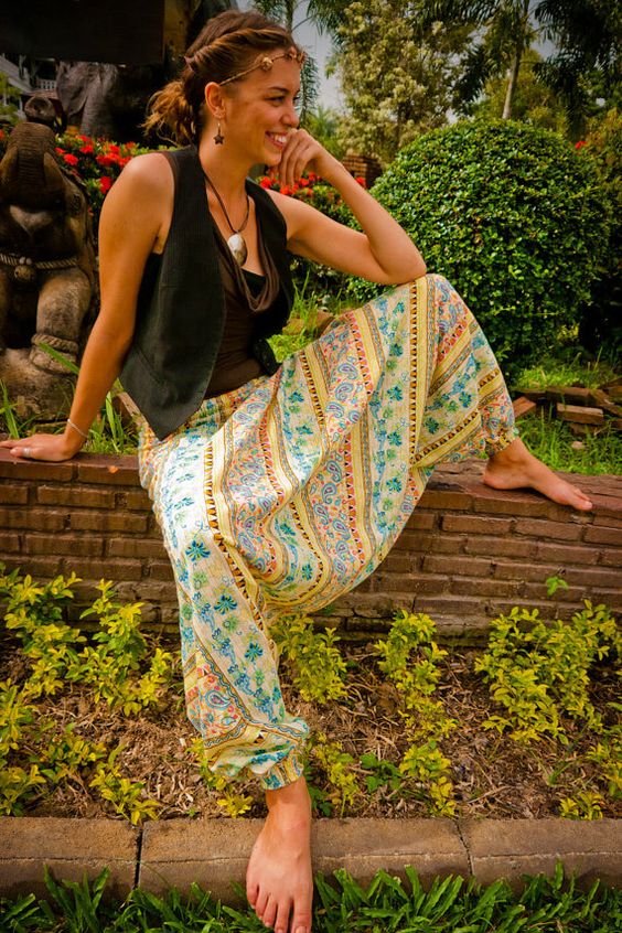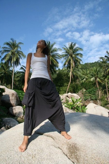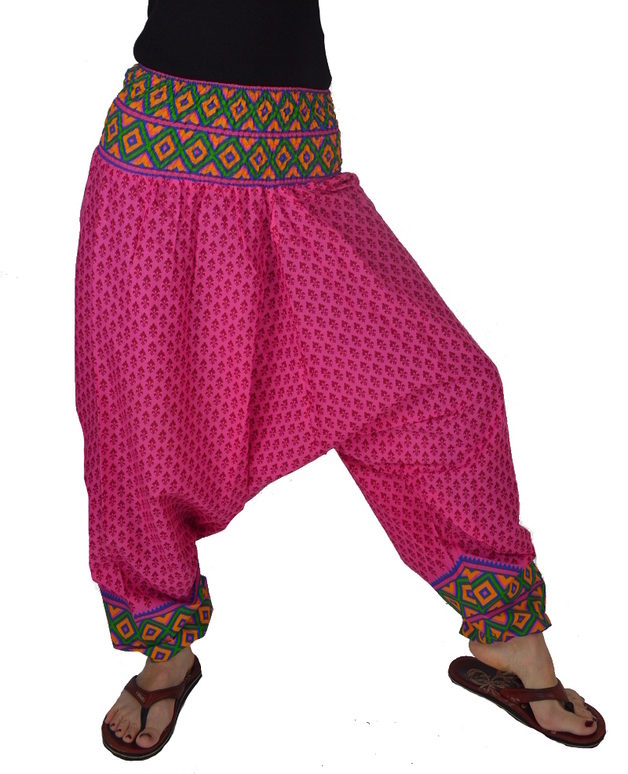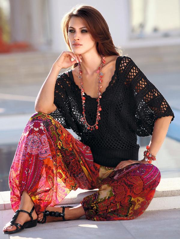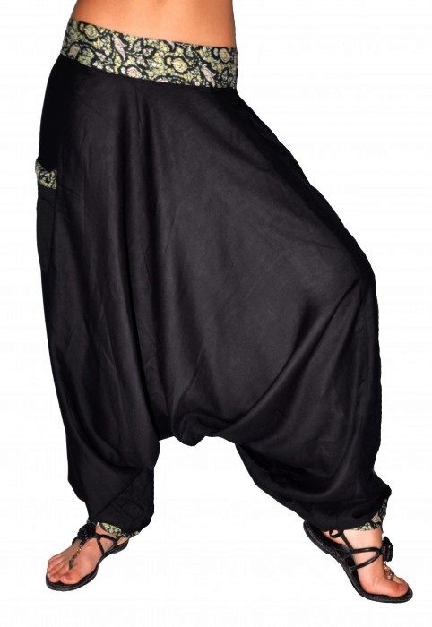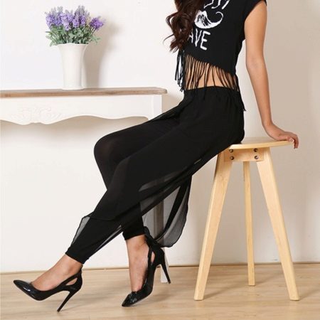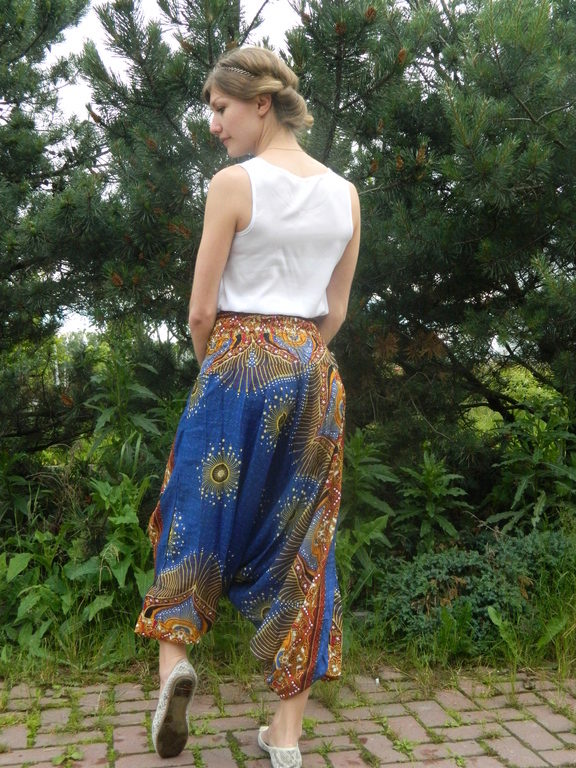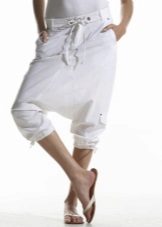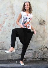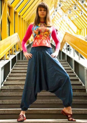 - Of great importance is the fabric from which the pants are sewn. Since harem pants are worn mainly in summer, but preference should be given to models made from natural fabrics - flax, cotton, etc. Thin knitwear is also a good option, but not for full beauties. For an evening look fit harem pants made of chiffon or viscose.