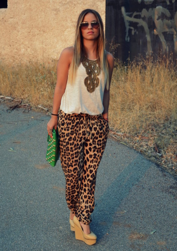 City of predators: harem pants with a leopard print, a light top with an original decor at the neck, a neutral color shoes and a miniature bright green handbag.